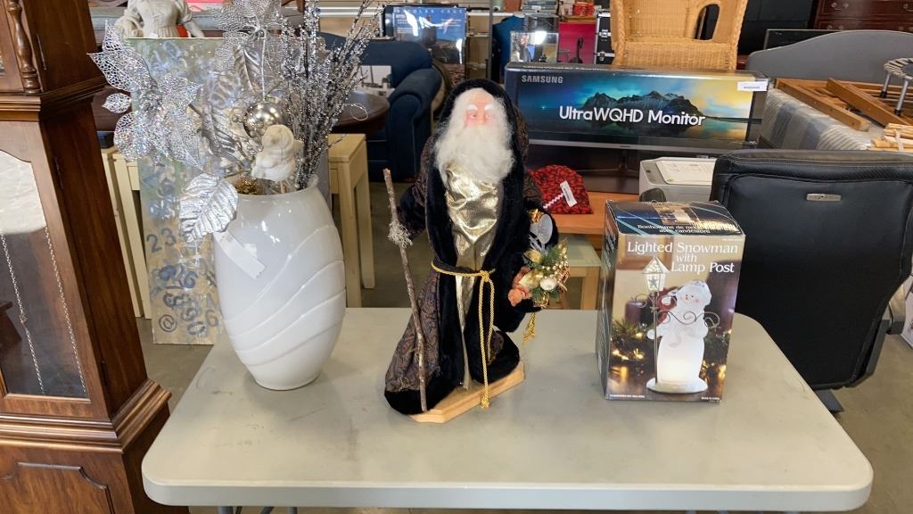 2 XMAS FIGURES AND MILK GLASS VASE