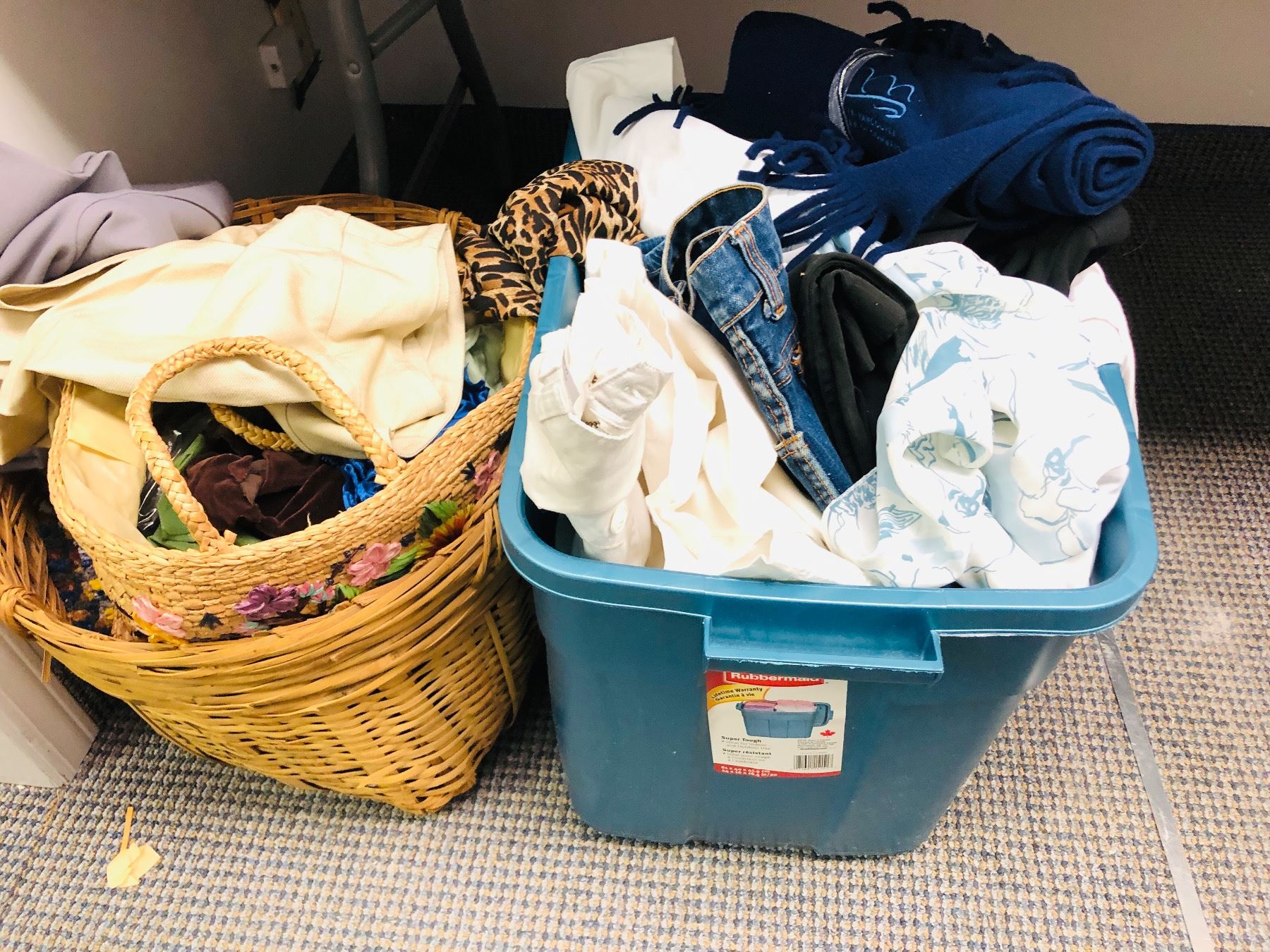 2 bins full of vintage estate clothes - includes pants / blue jeans / skirts / braided chair rugs etc