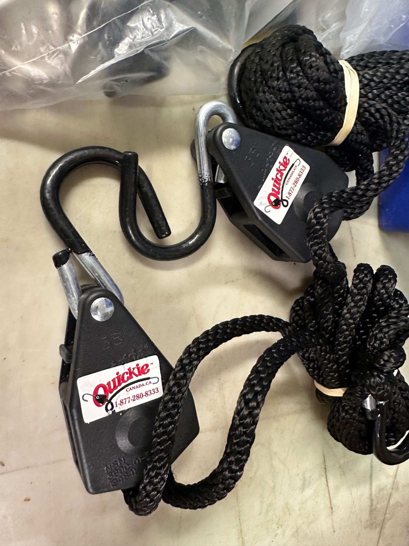 2 boxes & blue bin full of assorted tools & tool related items - includes bow saws / screwdrivers & screws / ropes / comfort wand etc