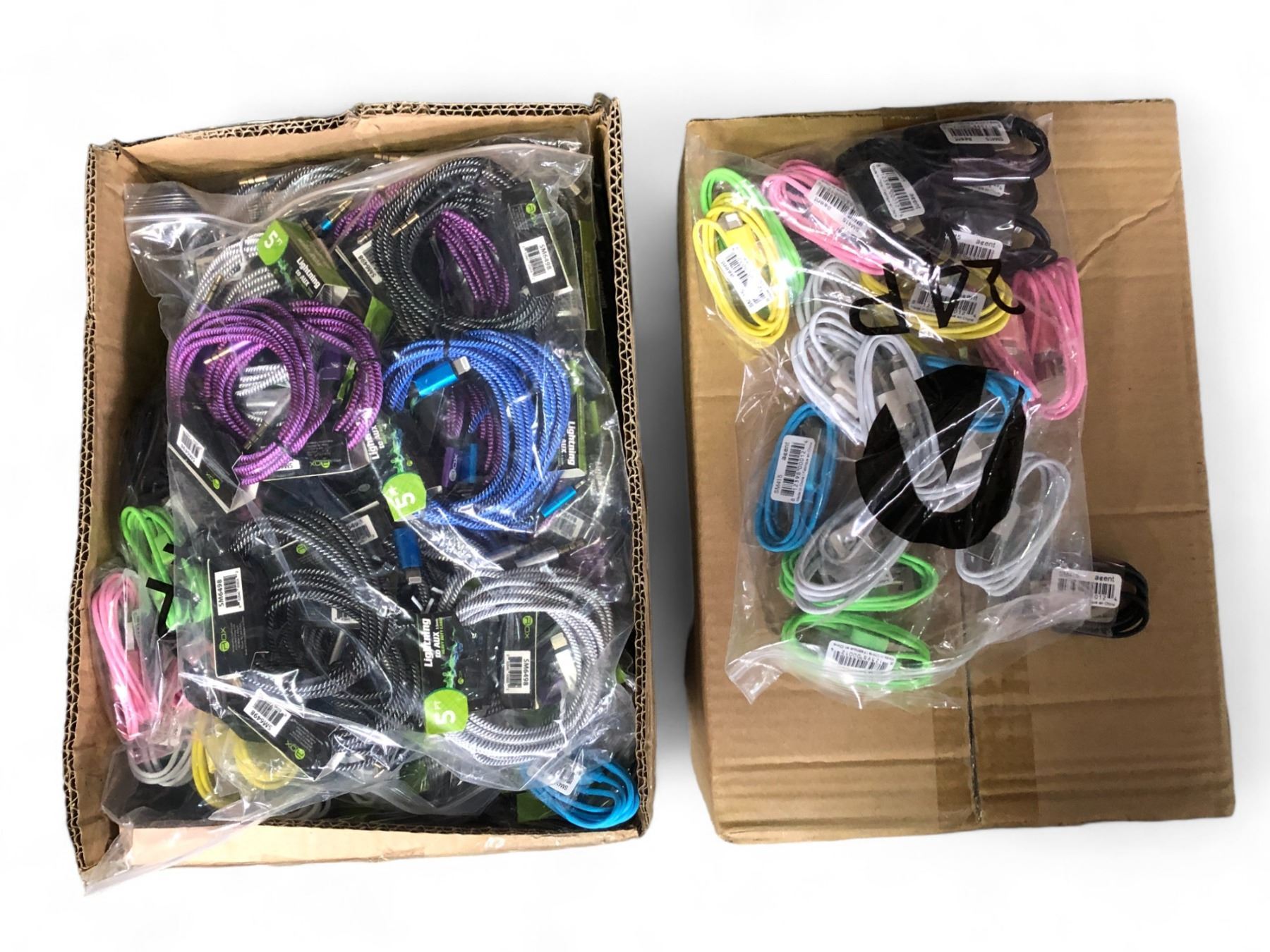 2 boxes full of assorted iPhone charging cables & Lightning to AUX cables - approx. 400pcs