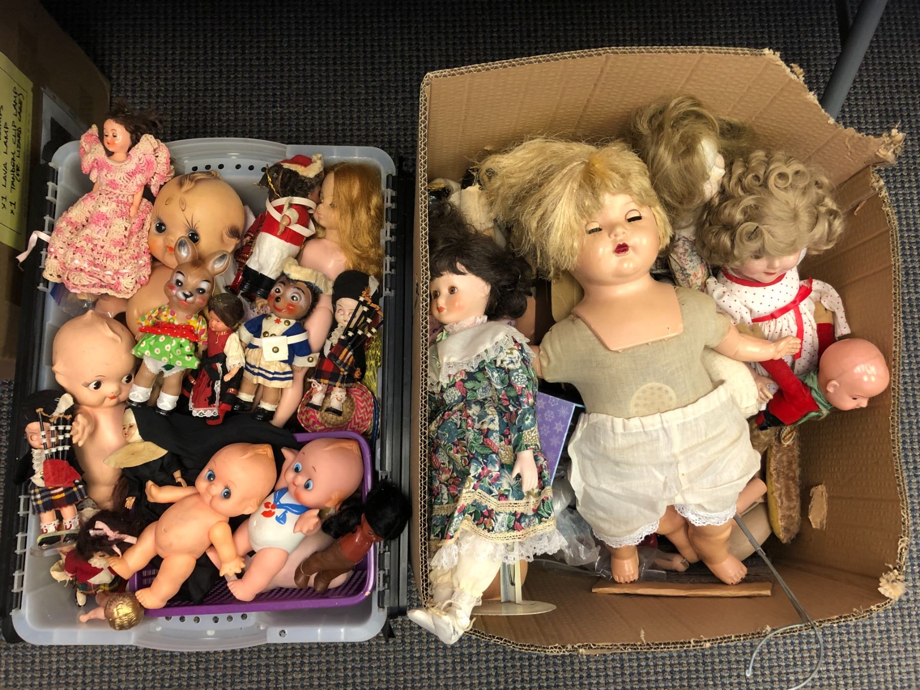 2 boxes full of assorted vintage estate dolls - includes baby dolls / boy doll in cowboy outfit / Scottish character doll etc