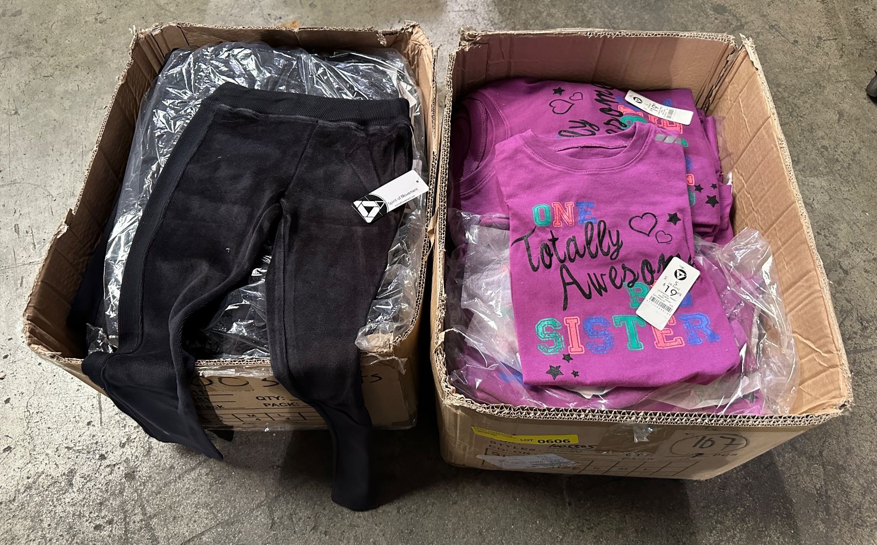 2 boxes of New Box of kids pants & "One totally awesome big sister"