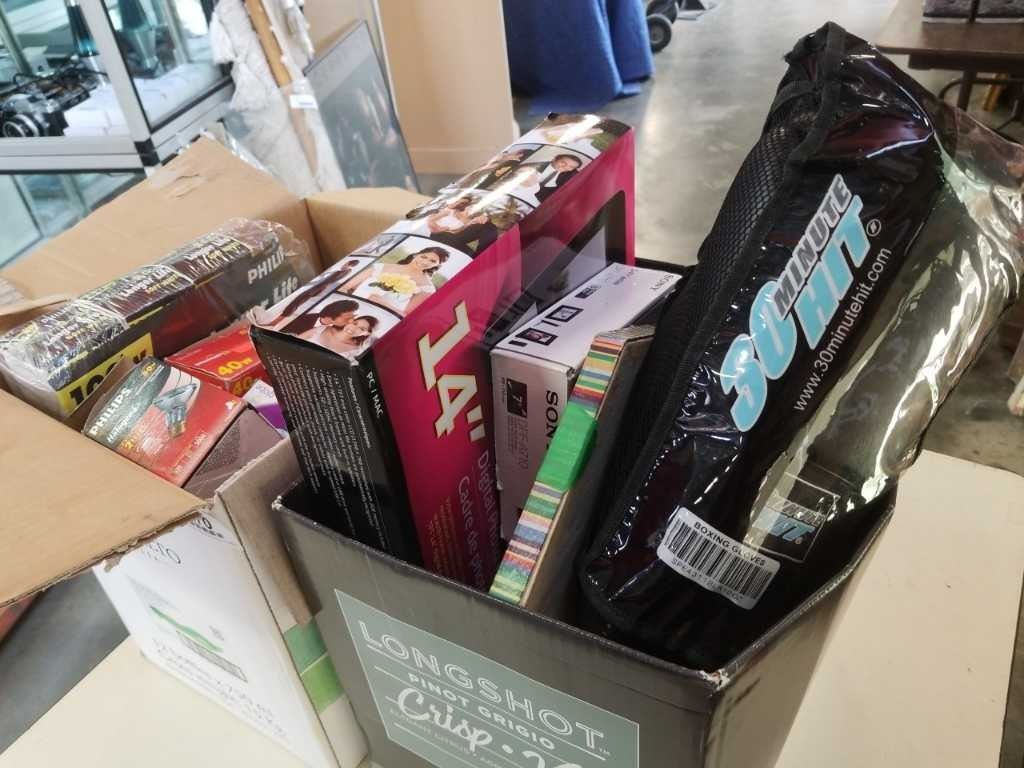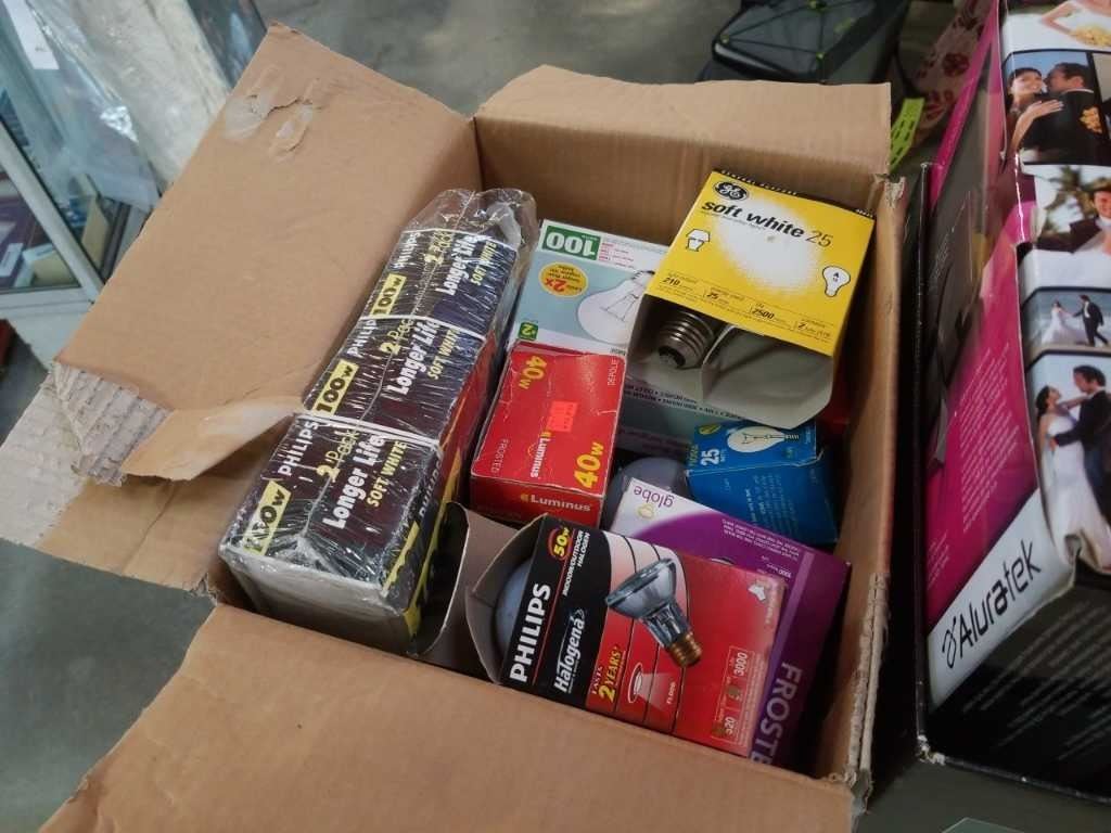 2 boxes of light bulbs with digital photo frames and more