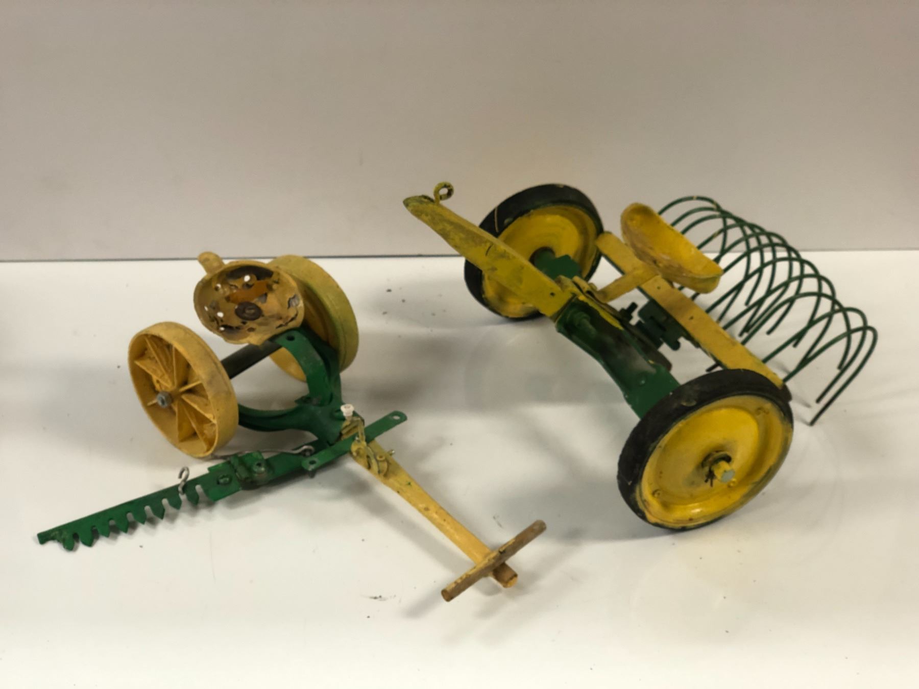 2 handcrafted green & yellow toy tractor attachments - hay rake & grass cutter