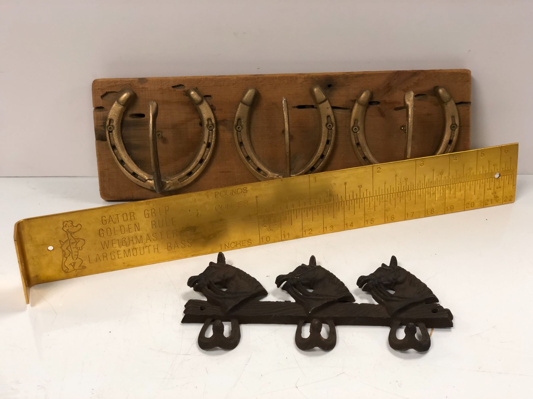 2 horse related wall mount coat racks & 1 gator grip golden ruler