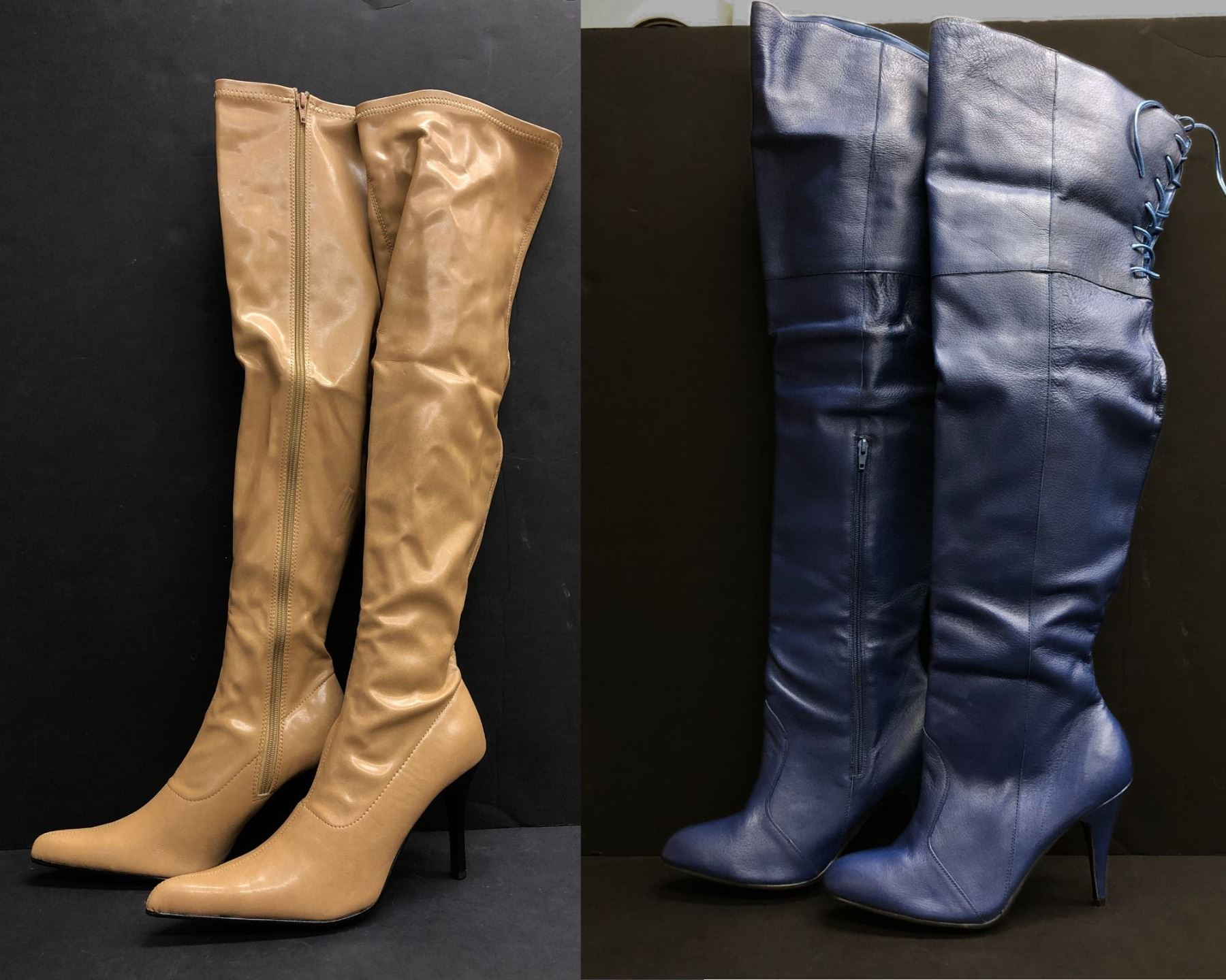 2 pairs of assorted knee-high high heel shoes - sizes Blue Leather 4" heel US 14 & Camel Stretch 4" heel US 10