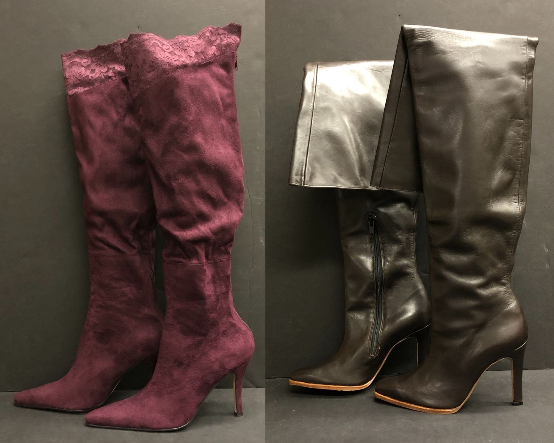 2 pairs of assorted knee-high high heel shoes - sizes Brown Leather 4" medium heel EU 41 & Elyssa Wine Suede Lace Top 4" heel US 10