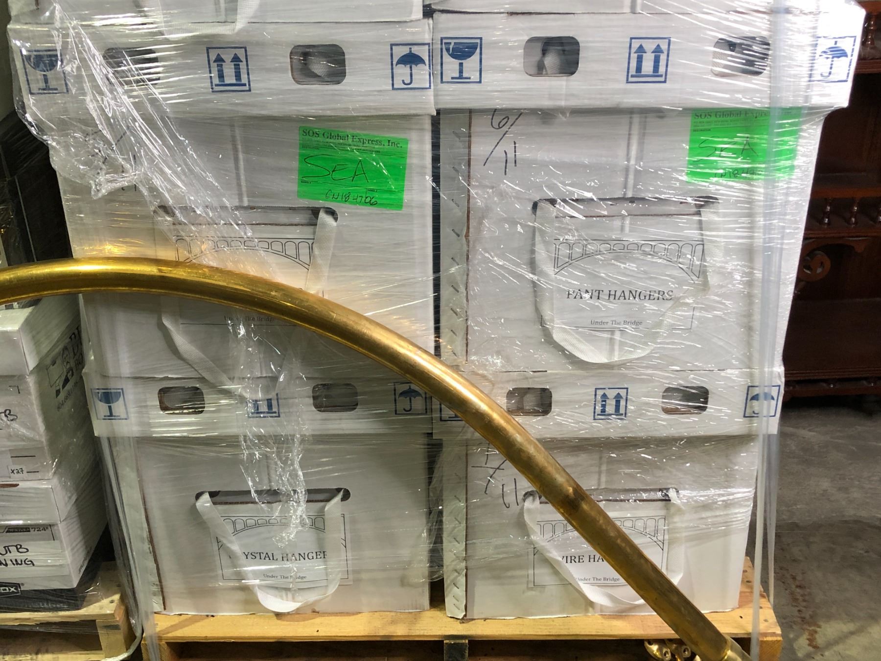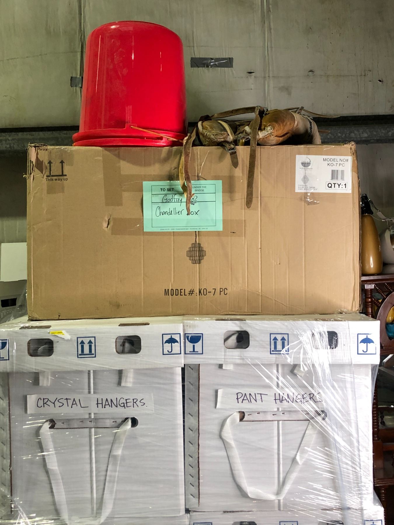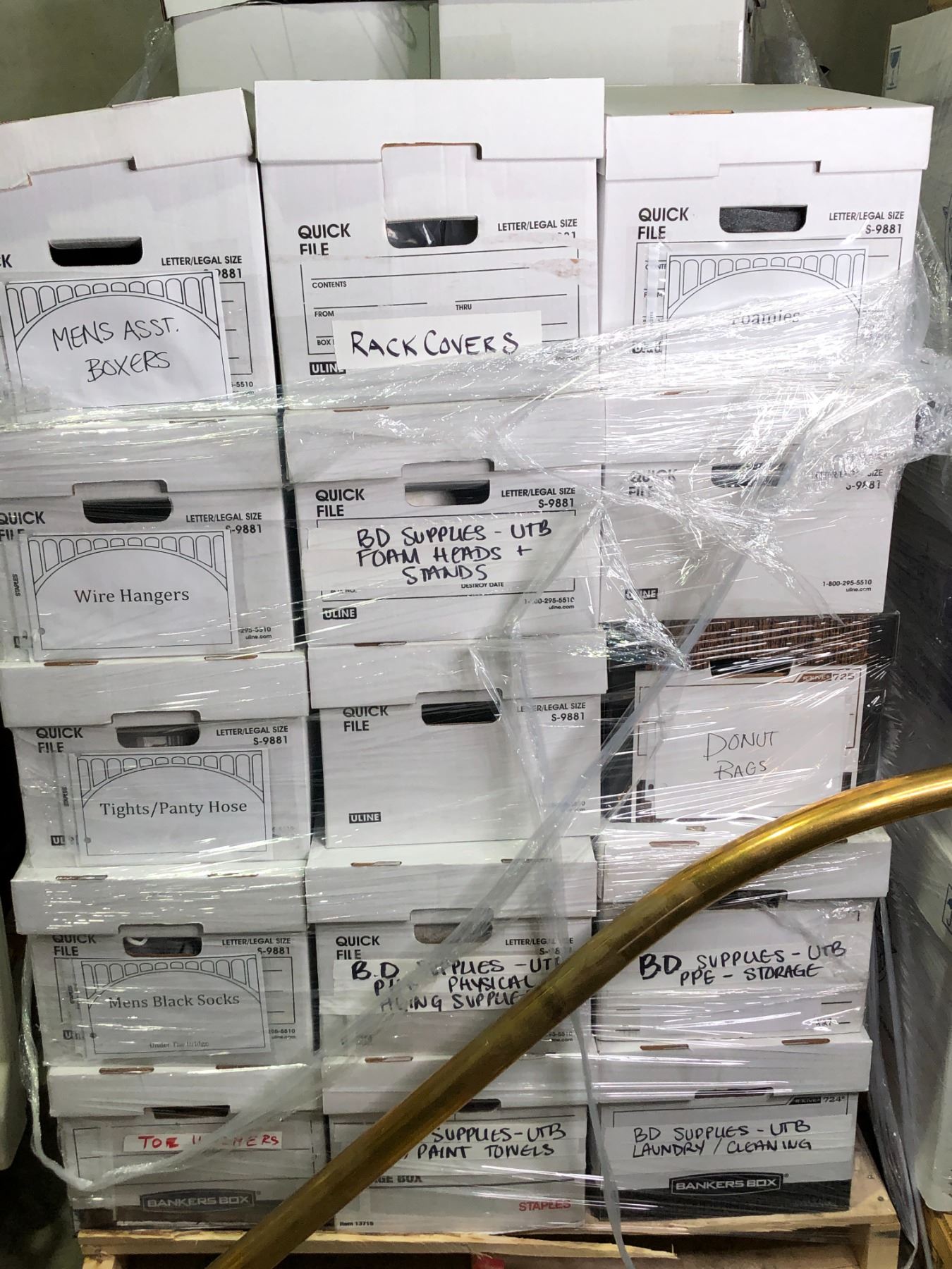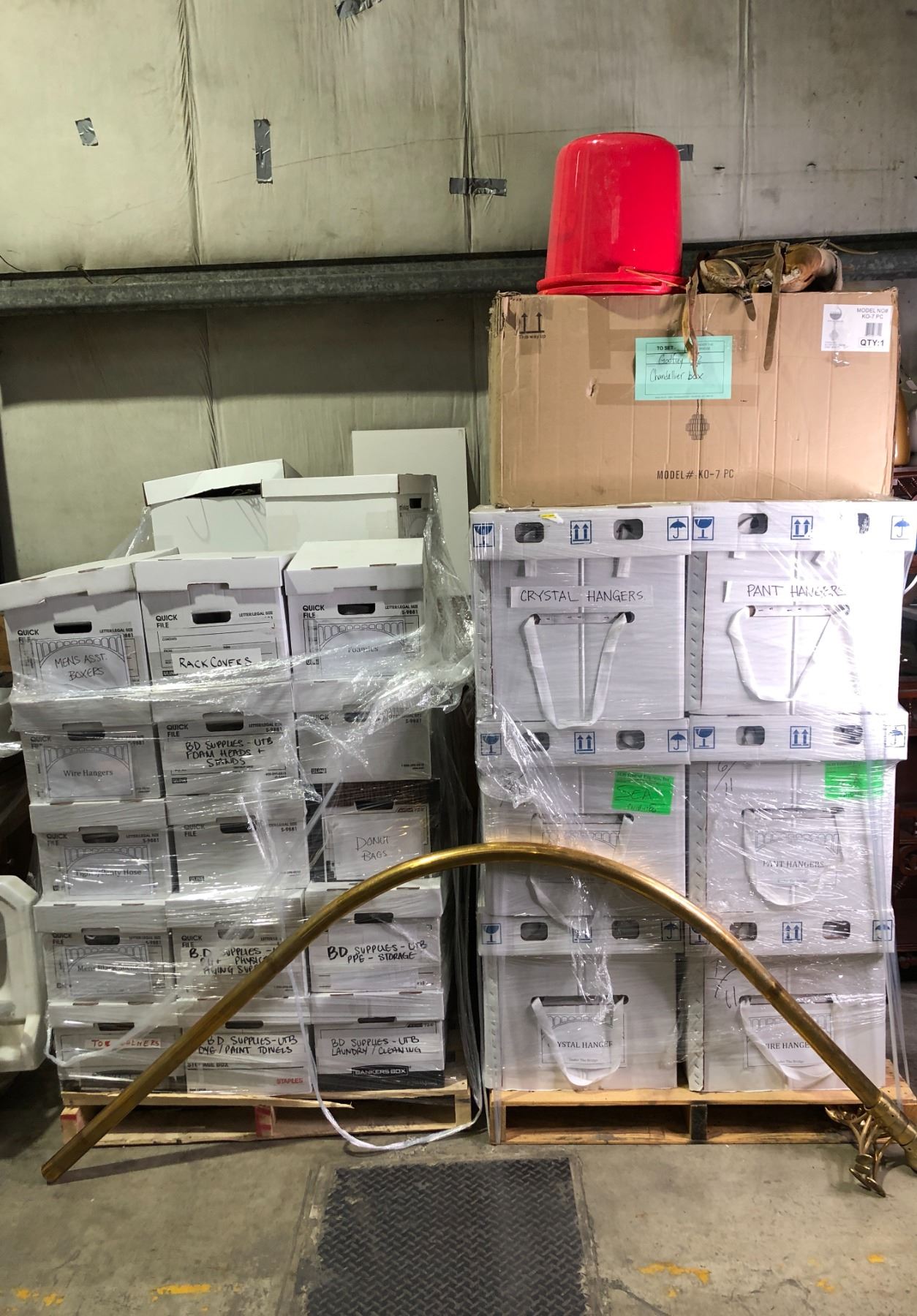 2 pallets full of set dec wardrobe items - includes crystal hangers/ pant hangers/ men's assorted boxers/ wire hangers/ misc. wardrobe supplies