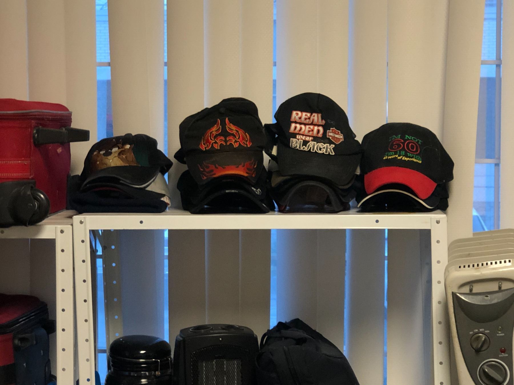2 rack full of misc items - includes 3 drawer filing cabinet / assorted hats / Mailmate paper shredd