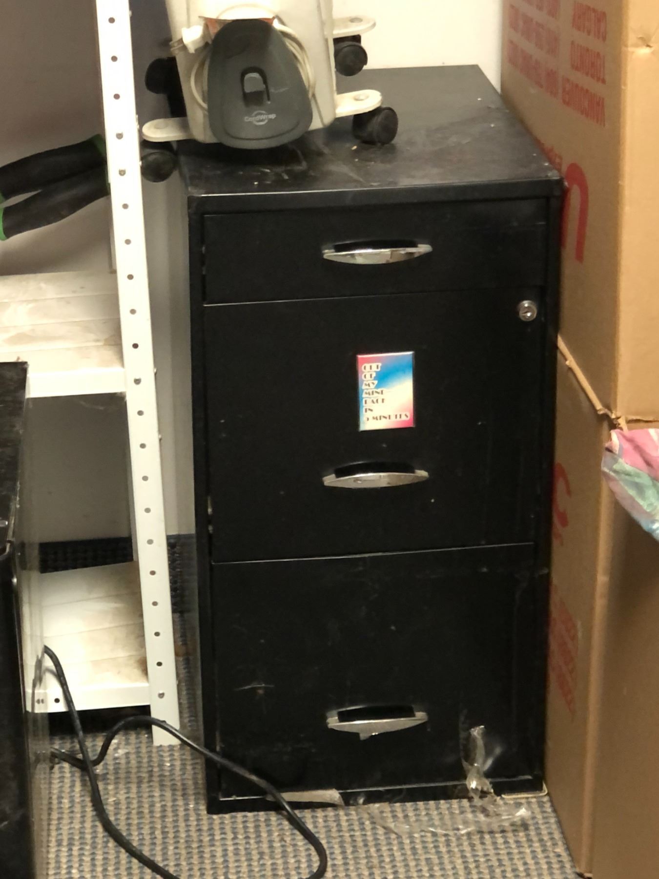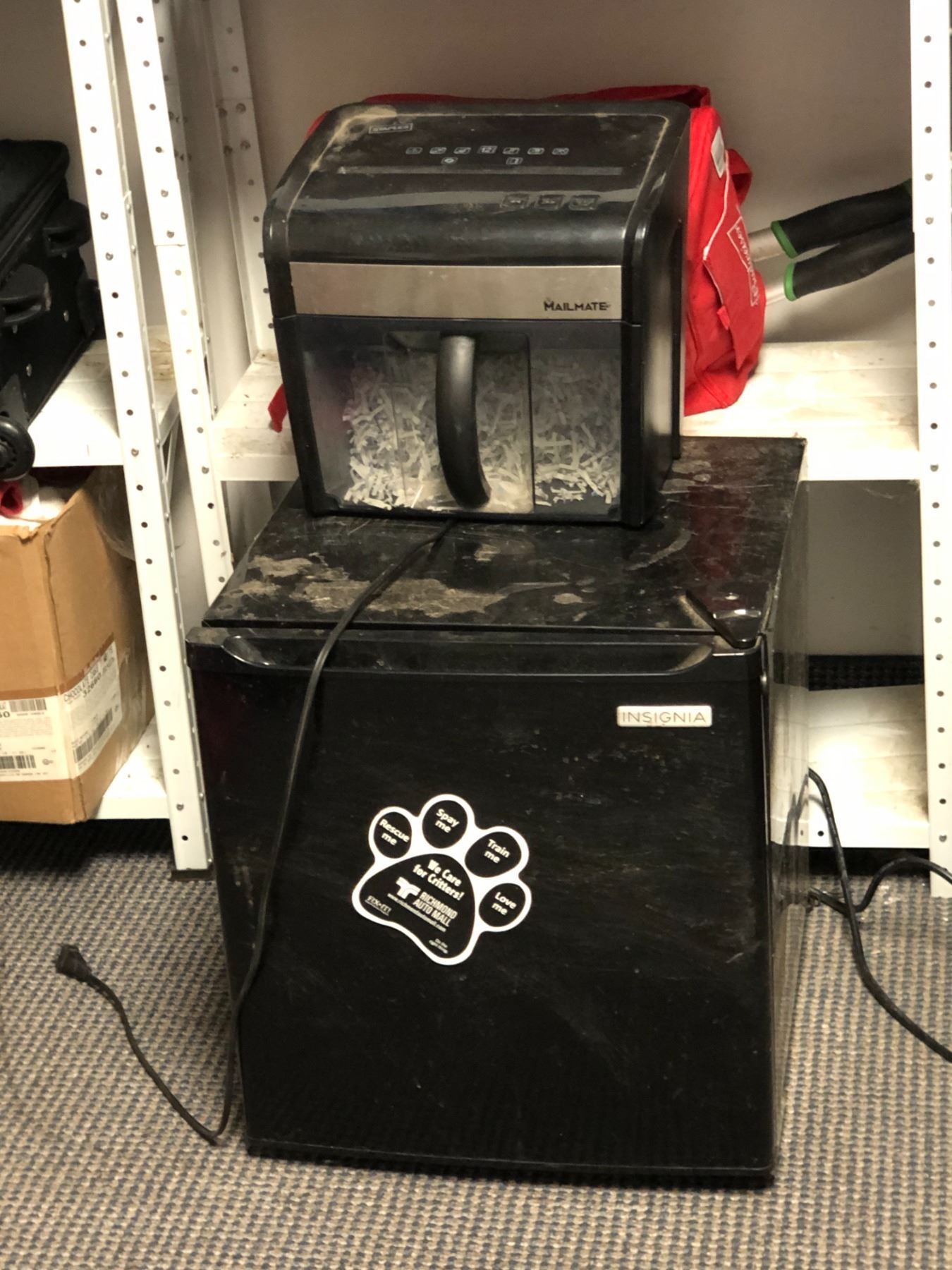 2 rack full of misc items - includes 3 drawer filing cabinet / assorted hats / Mailmate paper shredder / Insignia mini fridge / suitcases etc (racks included - approx 28" x 12" x 51' H)