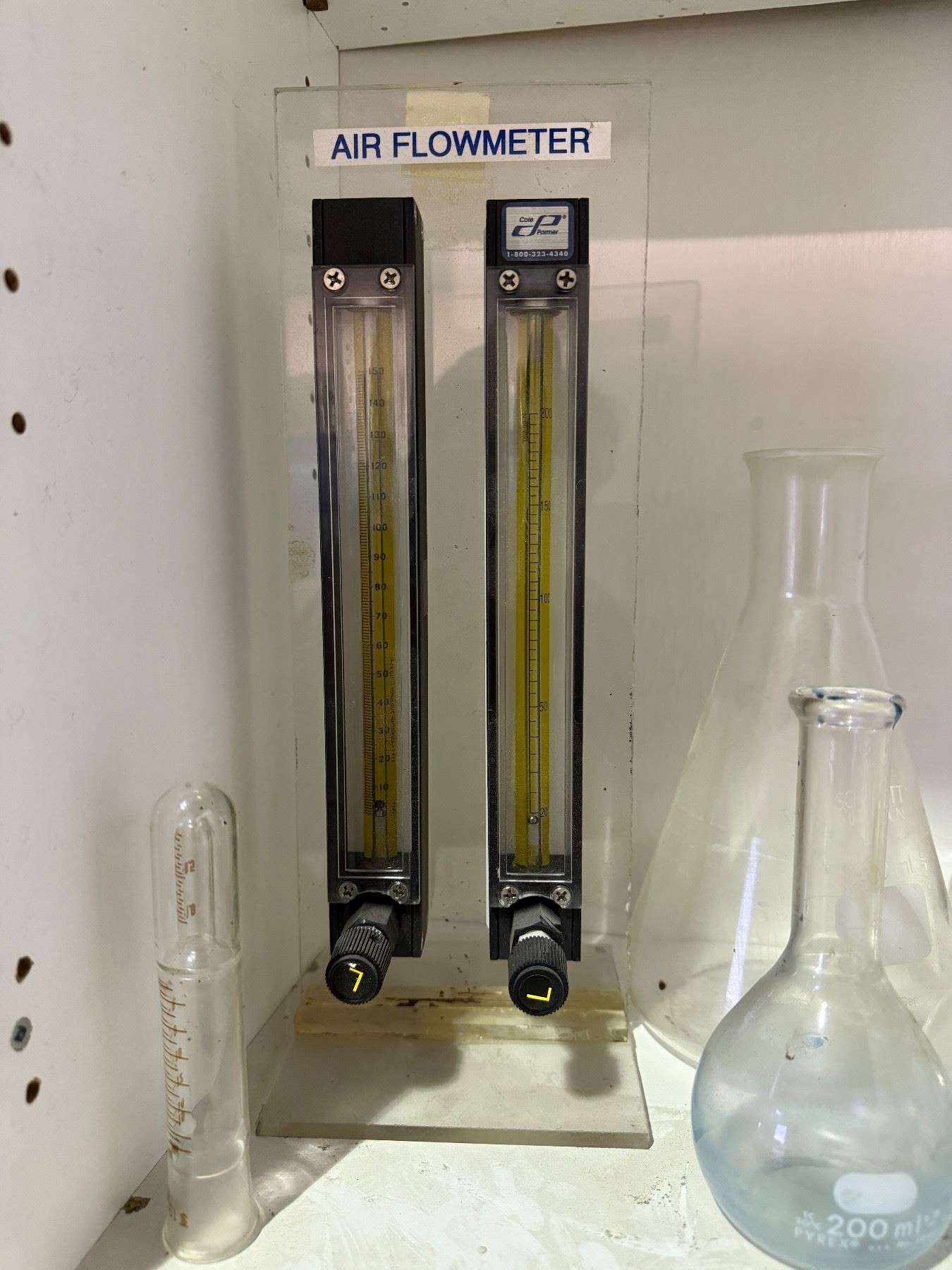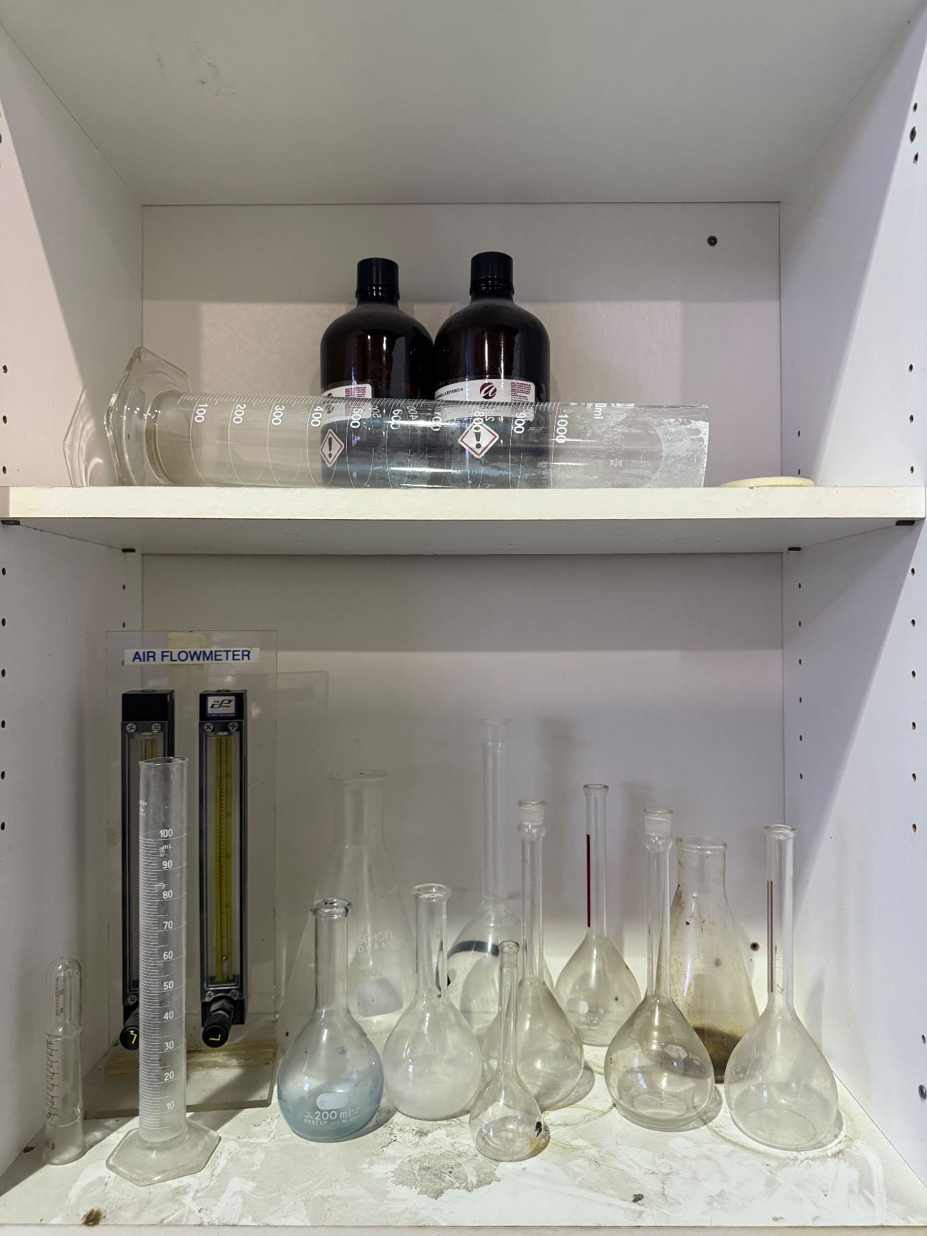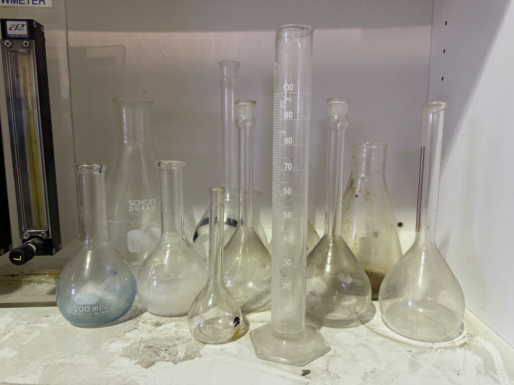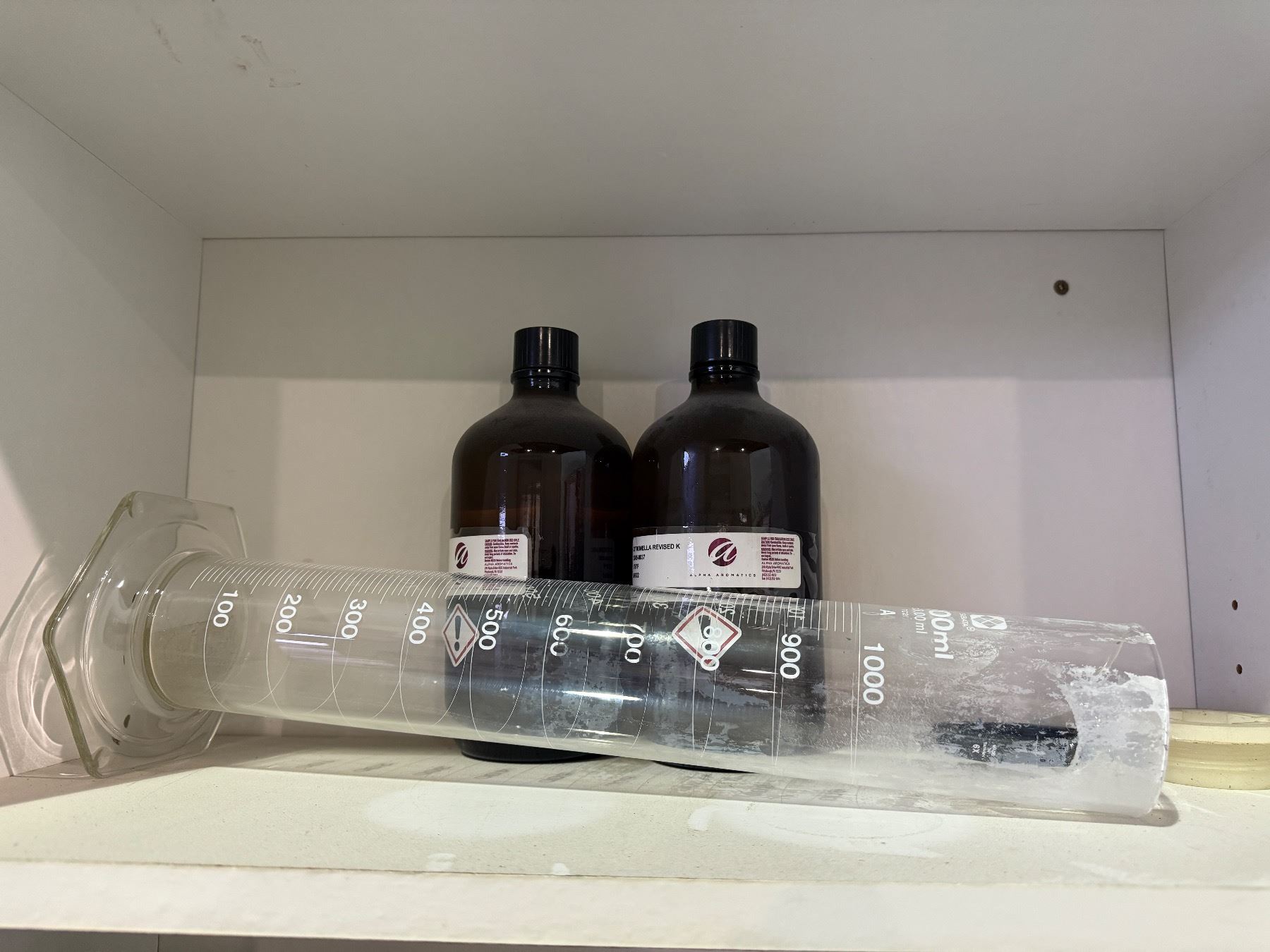 2 shelves - Misc. lab glass - graduated cylinders & x2 bottles of Citronella