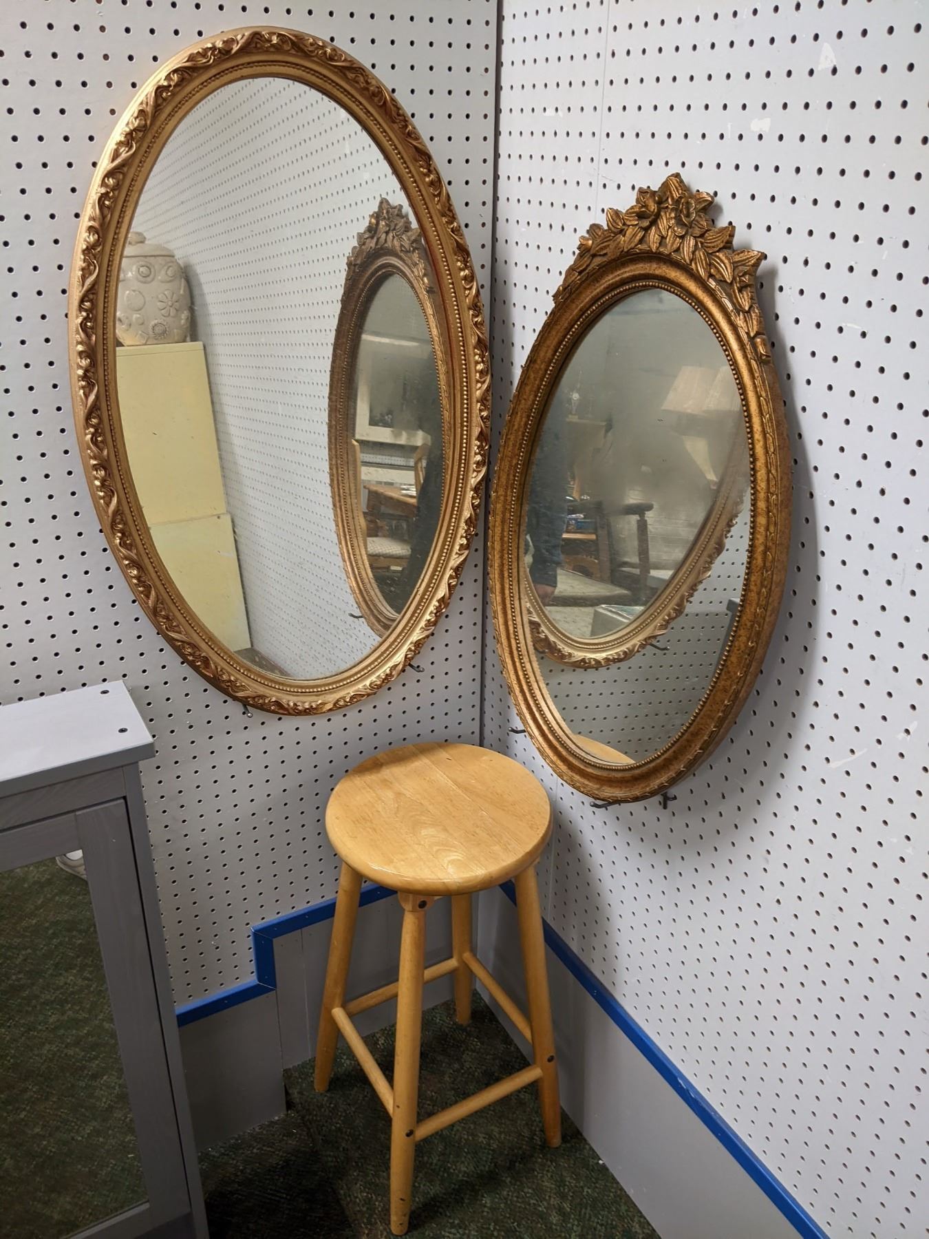 2 vintage guild framed oval mirrors & 1 wooden stool