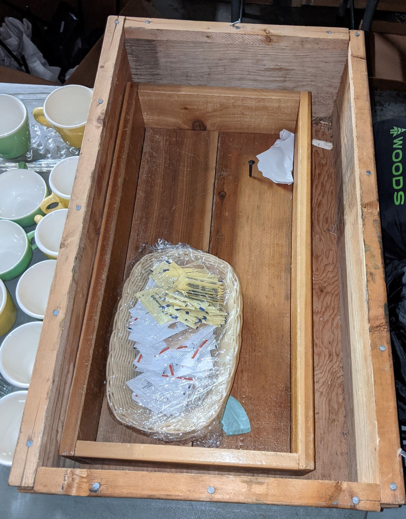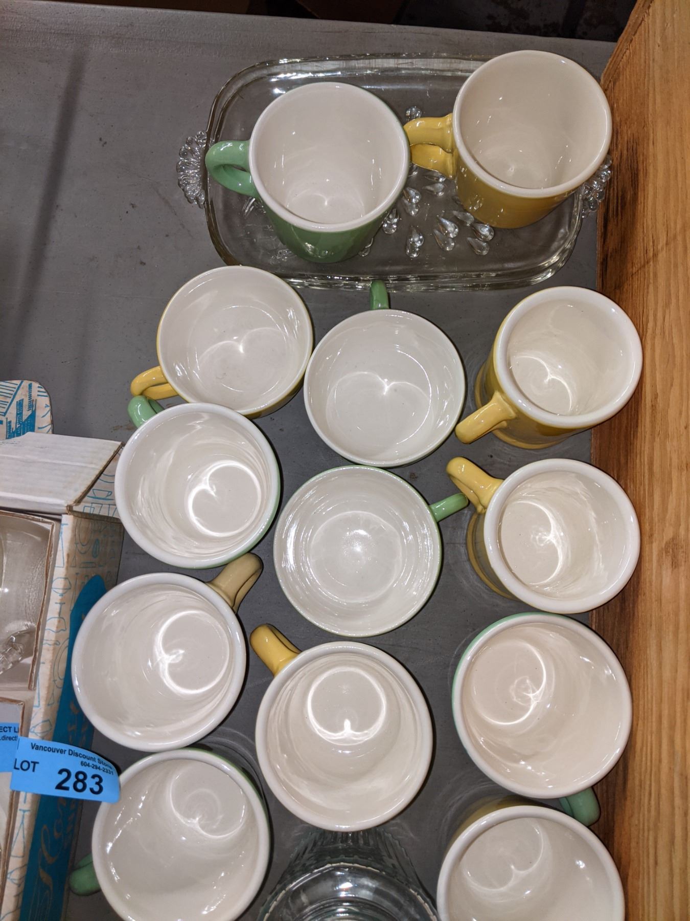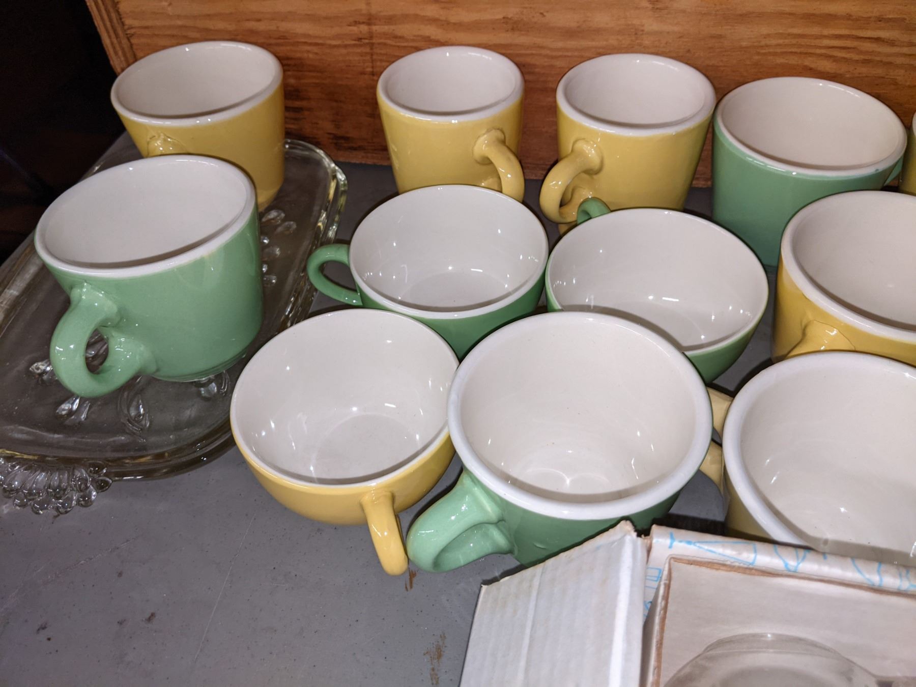 2 wooden boxes, coffee cups, glass cups and other miscellaneous items