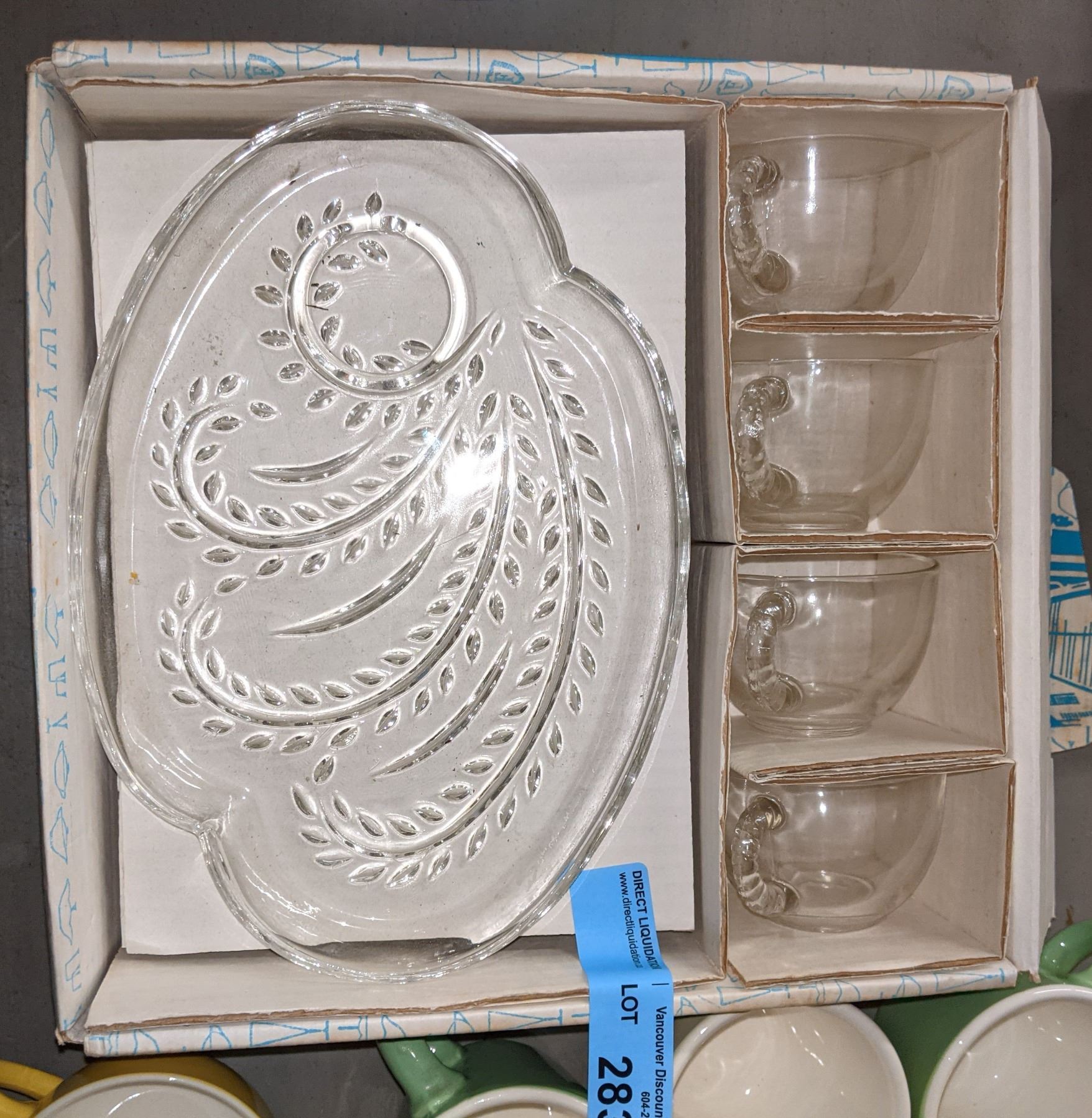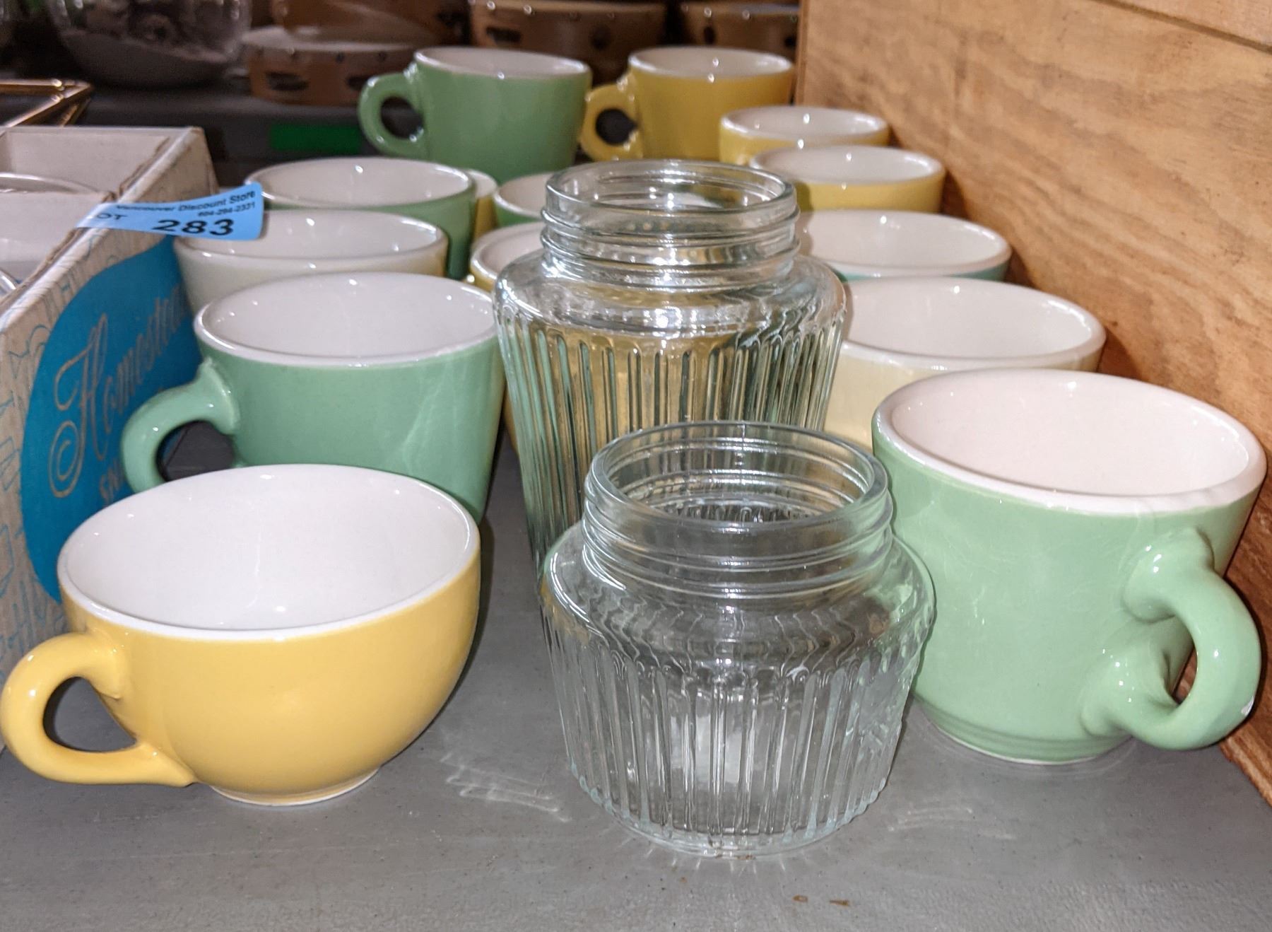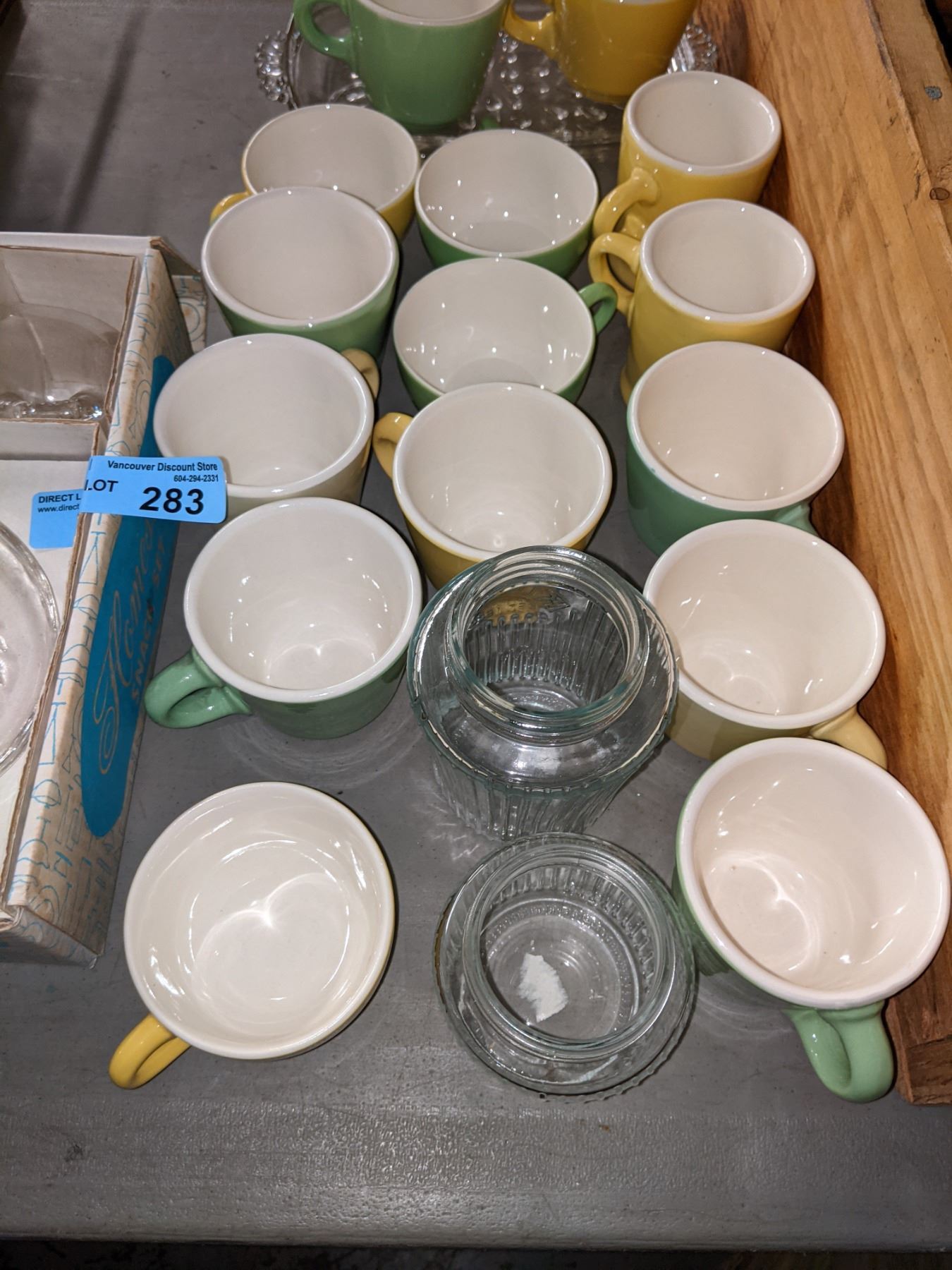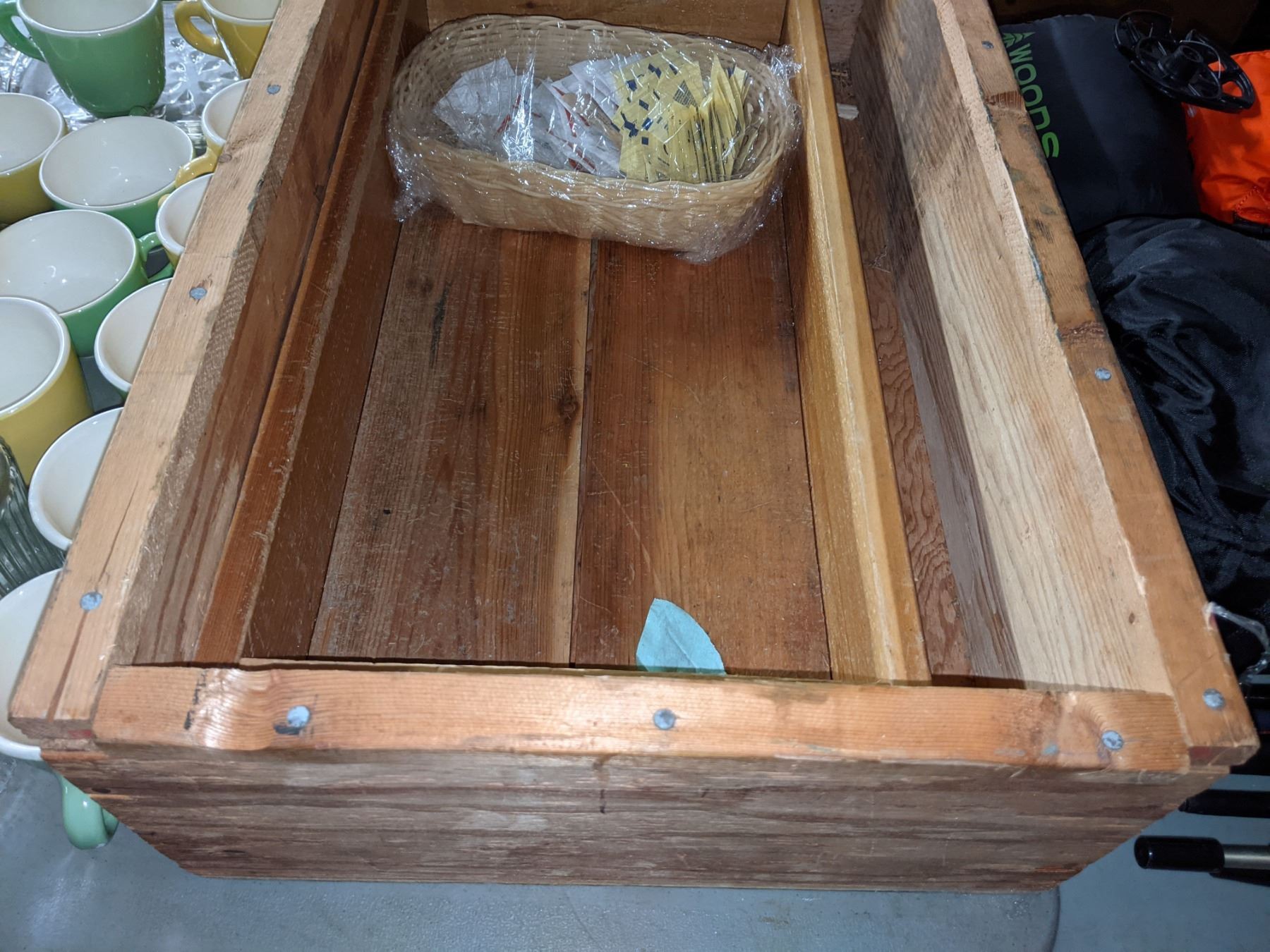 2 wooden boxes, coffee cups, glass cups and other miscellaneous items