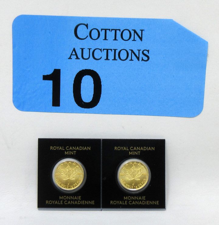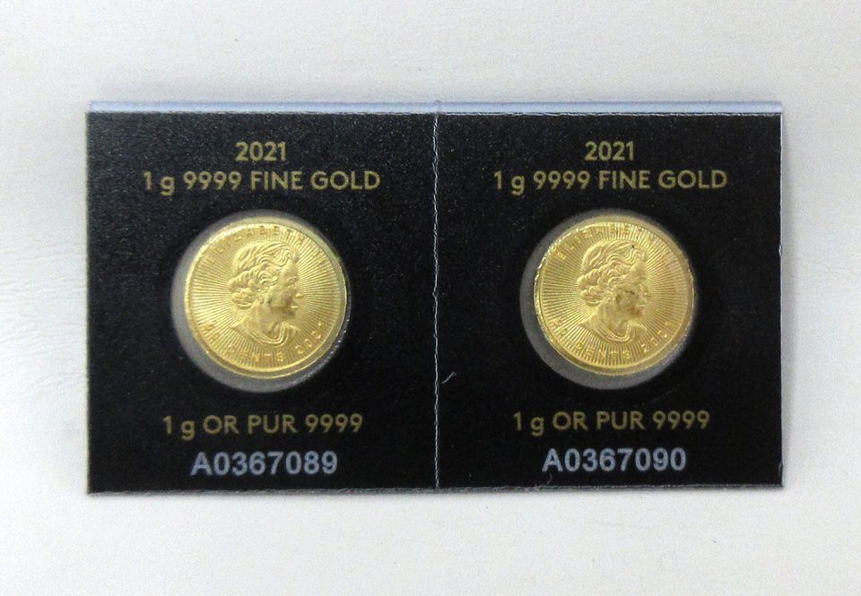 2 x 1 Gram .9999 Fine Gold 2021 Maple Leaf Coins in Assay Cards