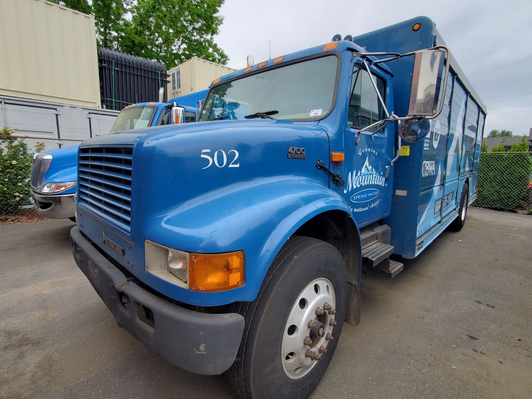 2001 INTERNATIONAL 4700 D7466E FREIGHT VAN, BLUE, VIN # 1HTSCAAR51H397729 399,191KMS, DIESEL, AUTO RD,CD,CC, AIR BRAKES, HACKNEY SIDE LOAD BOX 17 6X ICBC NO DETAILS