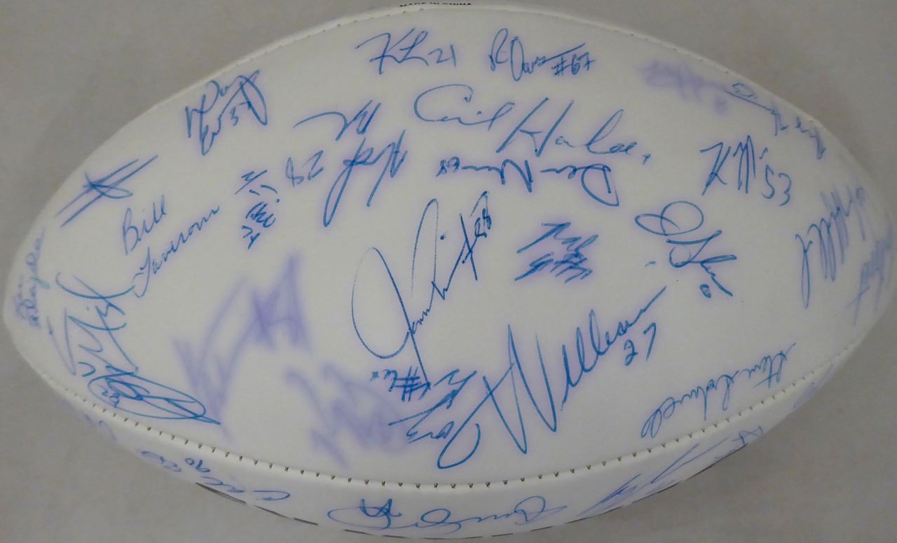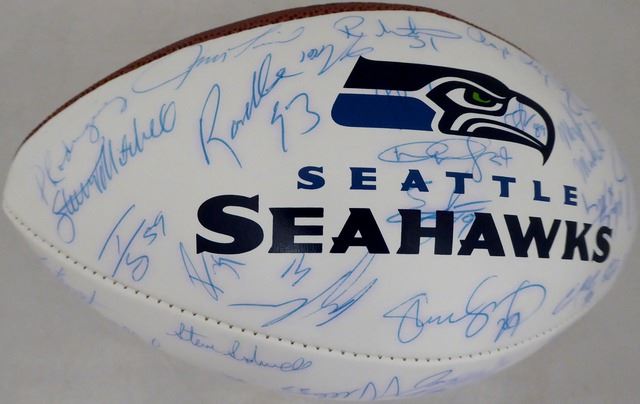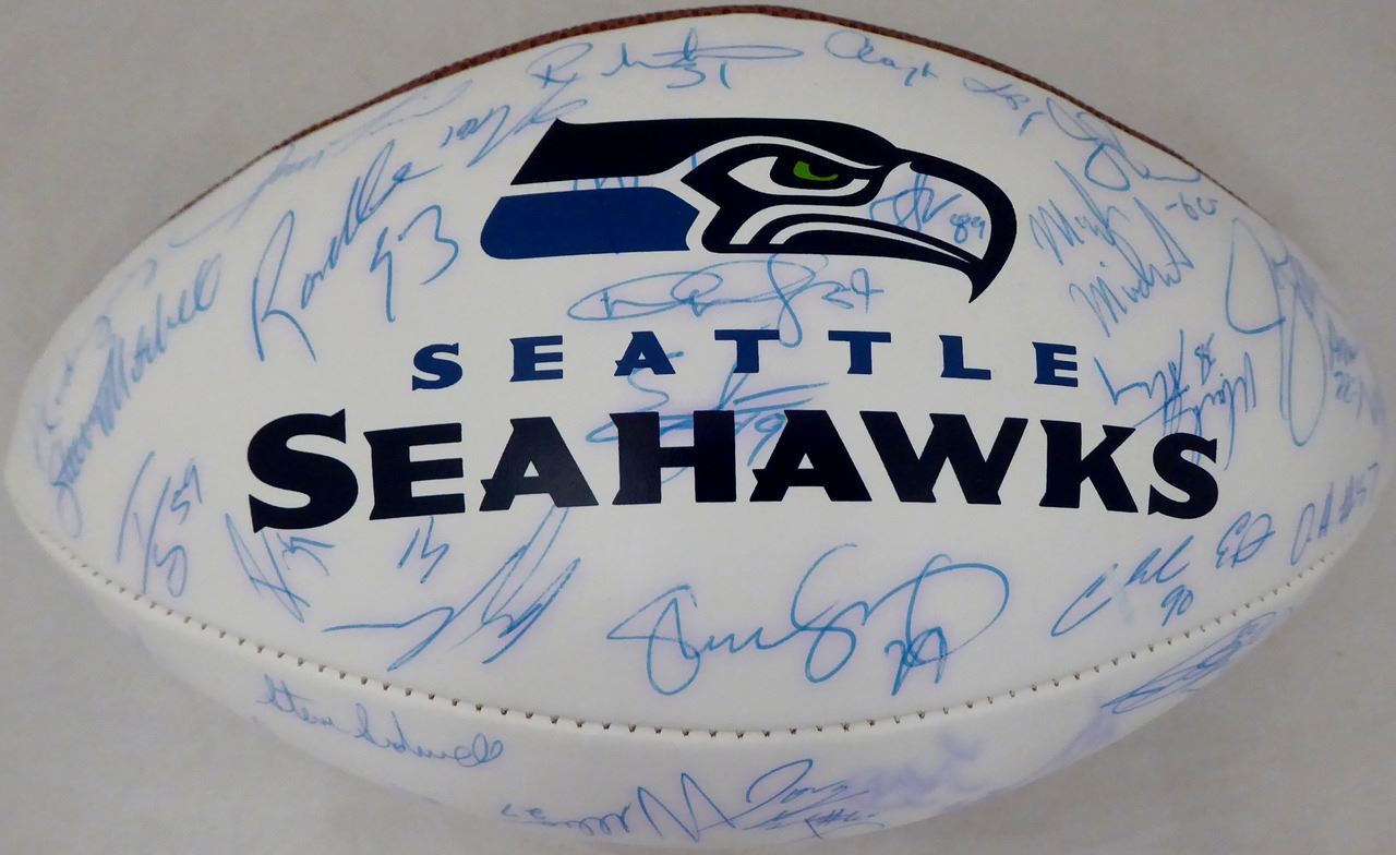 This is a Wilson Logo Football that has been hand signed by 60+ members of the 2002 Seattle Seahawks Team. Signatures include: Matt Hasselbeck, Walter Jones, Jim Zorn & Chris Gray. NOTE: A couple of the signatures are light or smudged, as shown in the pictures.