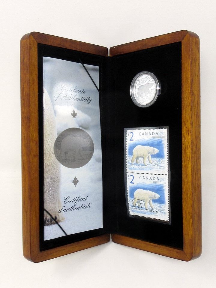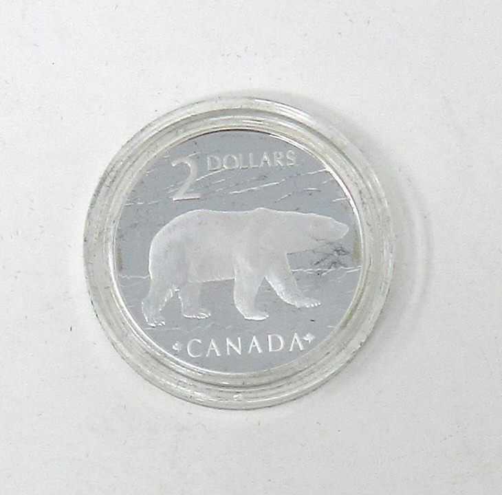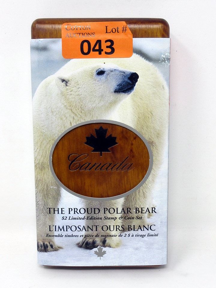 The Proud Polar Bear. $2 Proof coin struck in sterling silver, and two $2 stamps, one cancelled and one mint. Limited Edition; 25,222.