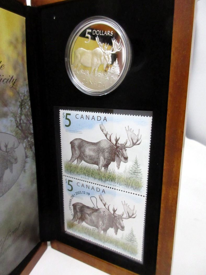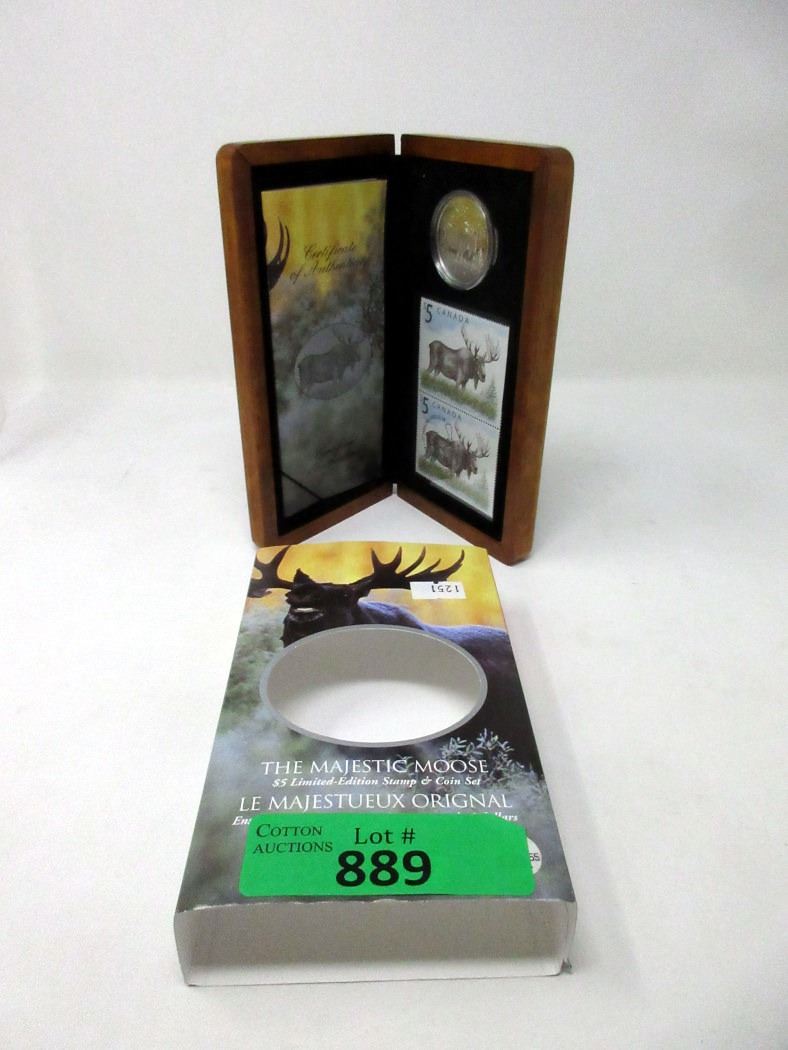 "The Majestic Moose" $5 Coin and Two $5 Stamps. Ltd. Edition of 25,555. In collector box. Tax exempt.