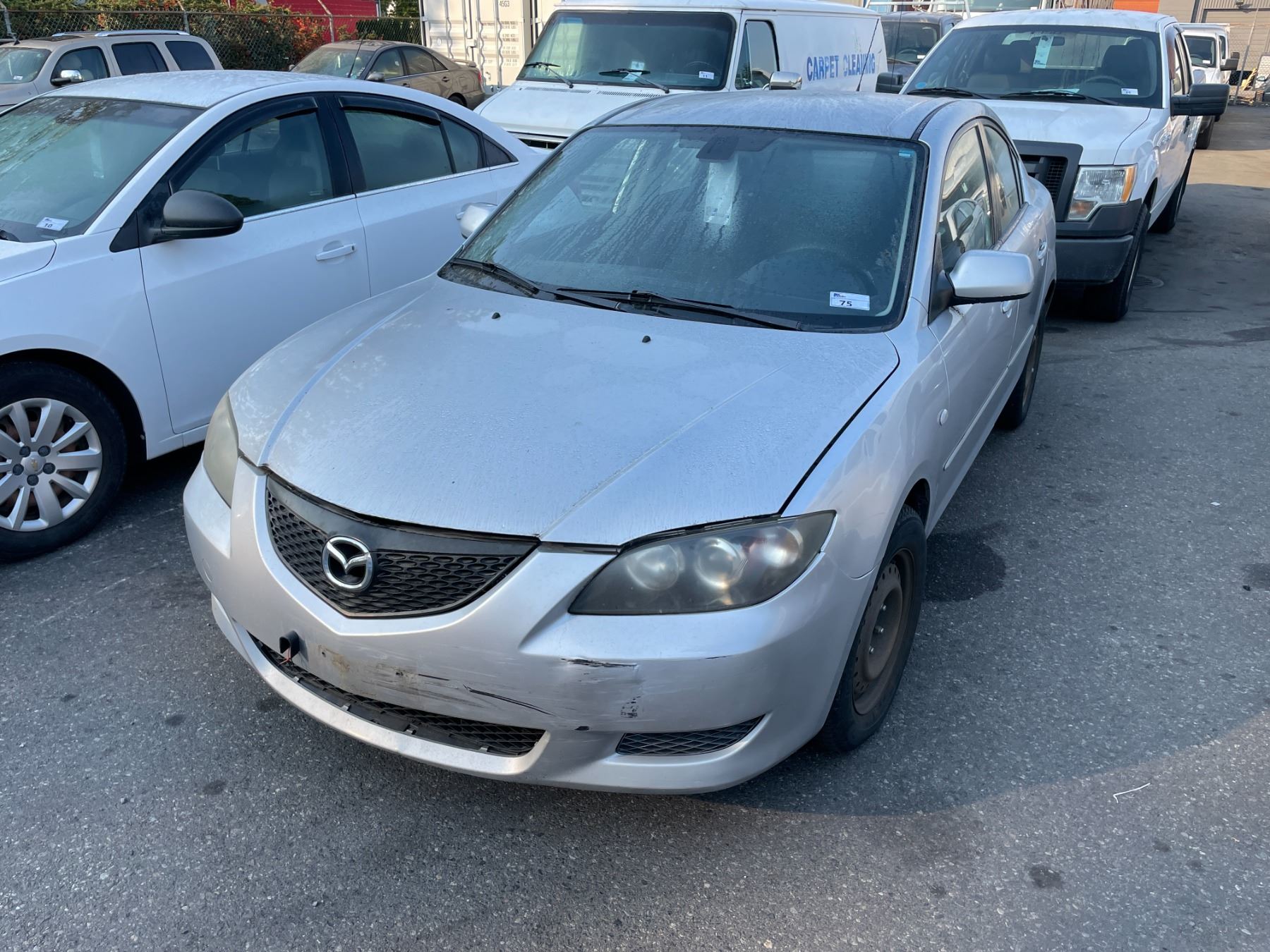 2004 MAZDA 3, 4DR COUPE, GREY, VIN JM1BK12F141117046 281,349 KMS, GAS, 2.0L, AUTO RD, CD, PW, CC, PL, TW, AC CHECK ENGINE LIGHT ON, NEW BATTERY, OIL CHANGED, NEEDS SUSPENSION REPAIRS, FRONT BUMPER CRACKED, RUST REAR FENDERS, DENT FRONT FENDER DRIVER SIDE, HAS KEYS, STARTS ICBC REPAIRED DECS TTL $10,421.56, 1X ICBC NO DETAILS