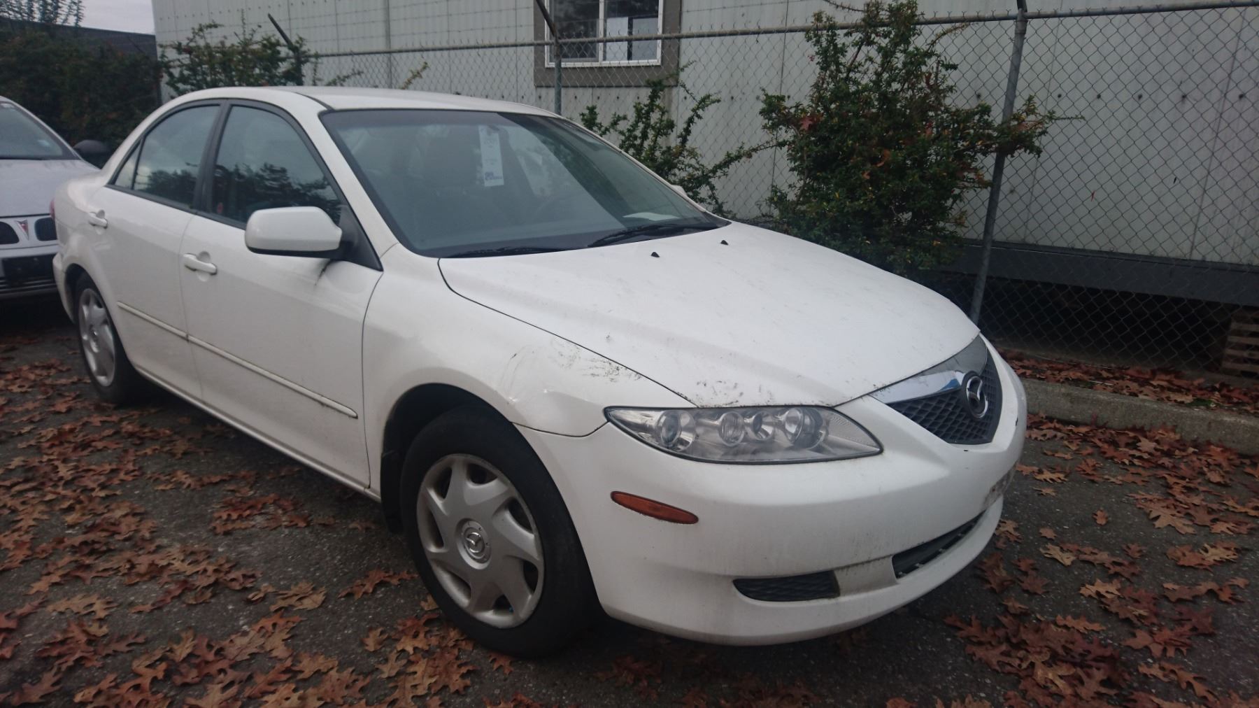 2004 MAZDA 6, WHITE, 4DRSD, GAS, AUTOMATIC, VIN#1YVFP80C445N42638, TMU *NO KEYS, MUST TOW, NOT ROADWORTHY* RD,CD,PW,PL,TW,AC, 3 ICBC ESTIMATES $2998.01, 1 ICBC DECLARATION NO DETAILS, 5 ICBC REPAIRED DECLARATIONS $8862.37, FLAT TIRES, INTERIOR STARTING TO MOLD