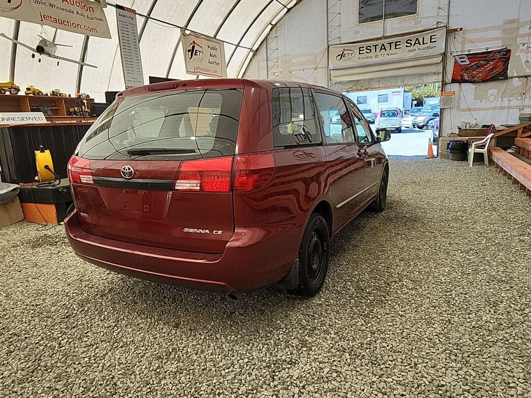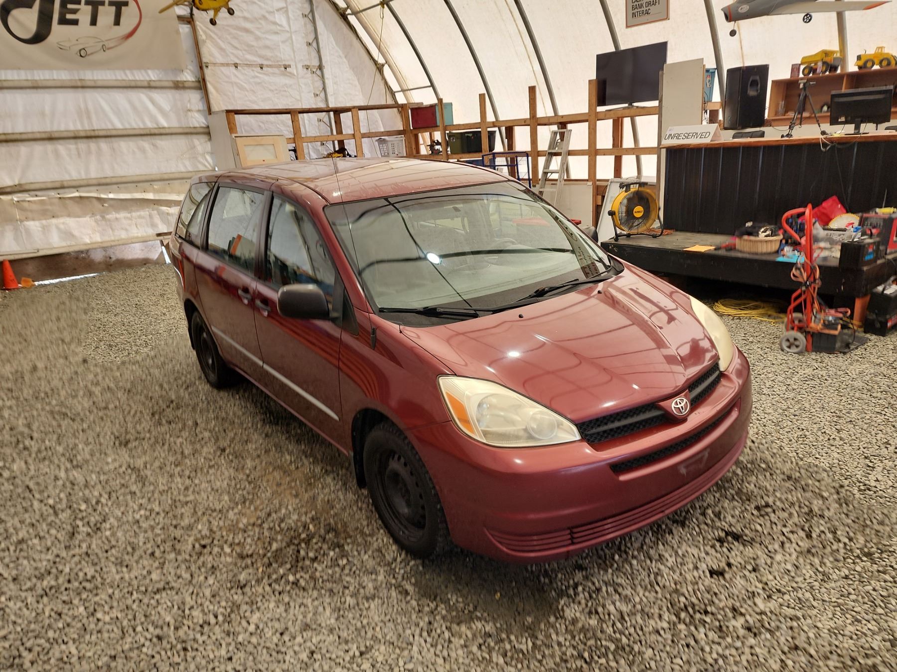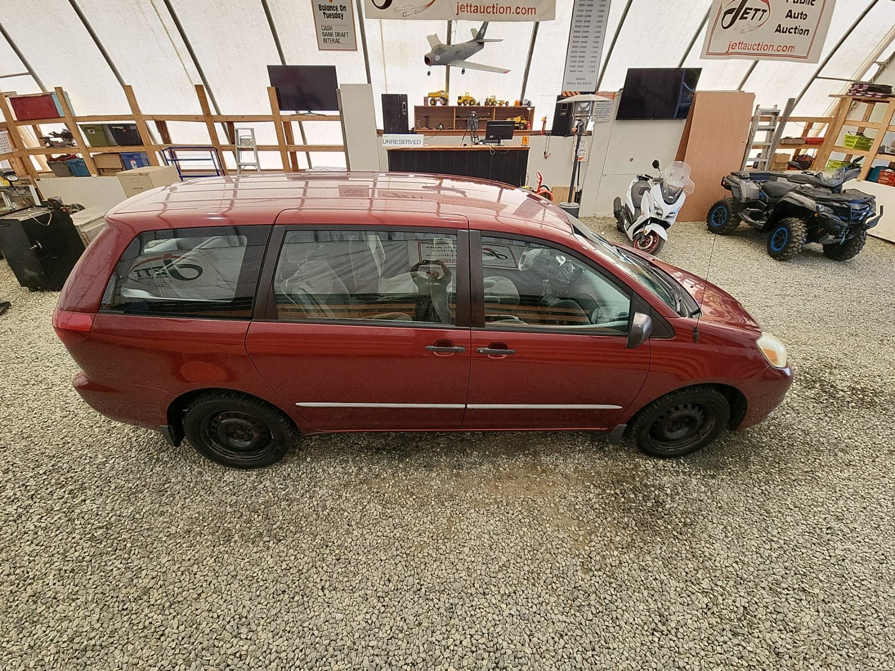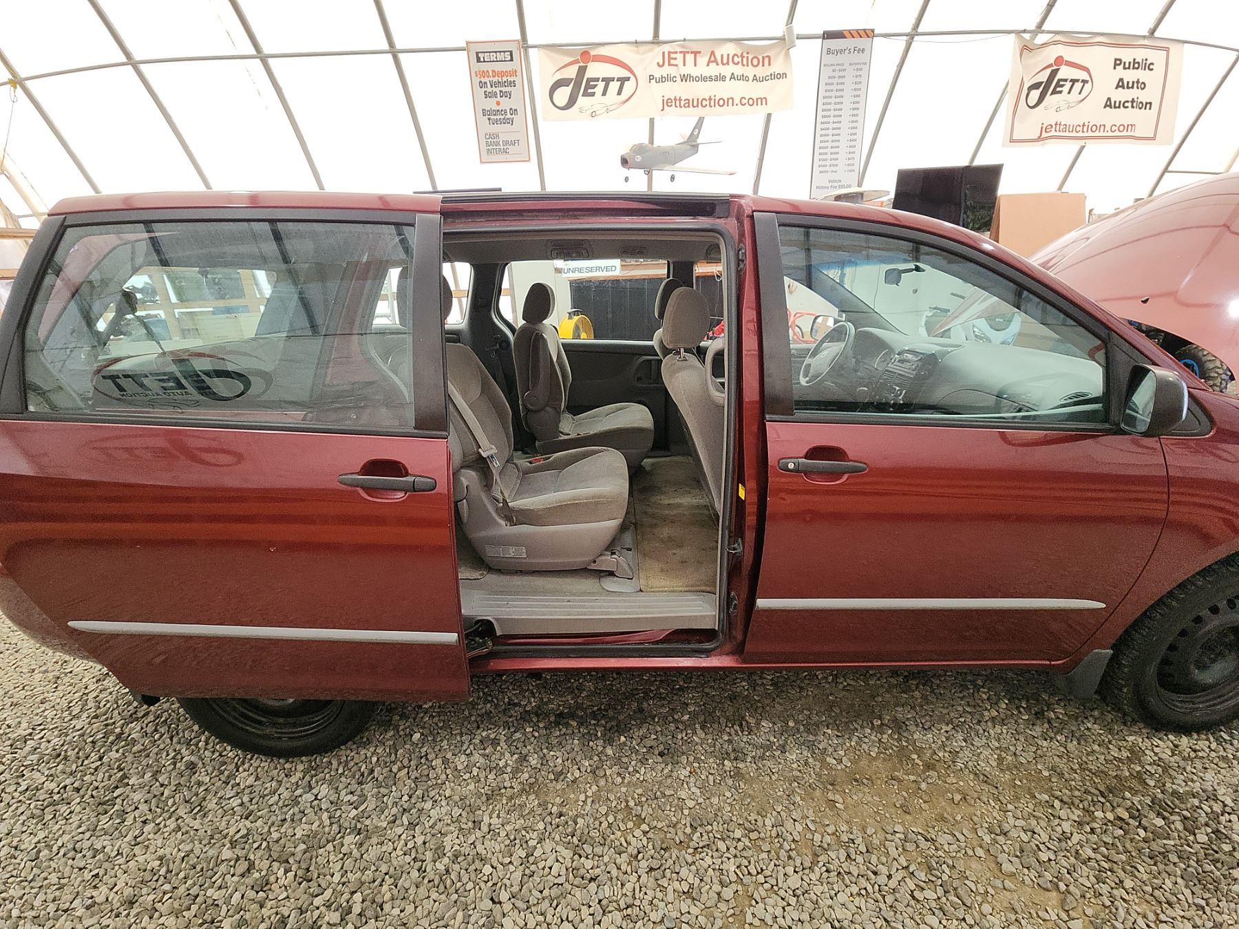 2004 TOYOTA SIENNA, RED, 351230 KMS, 3.3L, 6 CYLINDER, GASOLINE, AUTOMATIC, TRANSMISSION, FRONT WHEEL DRIVE, 7 PASSENGER. AIR CONDITIONING, POWER WINDOWS, POWER LOCKS, KEY-LESS ENTRY, TILT STEERING, ANTI THEFT, DUAL AIR BAGS, CD PLAYER, REAR HEAT AND AIR, POWER MIRRORS, NO REPORTED ACCIDENTS., CHIP OR CRACK IN WINDSHIELD, SPLIT-FOLDING REAR SEATS. DECLARATIONS: EX-LEASE 0 ACCIDENTS 0 GLASS CLAIM, TOTALLING $0. SERVICE HISTORY SHOWS11 RECORDS. AUCTION NOTES: STOCK #: D210462 5TDZA29C14S210462 NOT MECHANICALLY INSPECTED, NOT SUITABLE FOR TRANSPORTATION, MUST TOW.