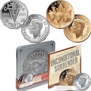 2x Coins oversized large 5 cent coin & Silver 5 cent coin Royal Canadian Mint with Display Metal Box, Certificate of Authenticity, informational historical WWII booklet & Sleeve