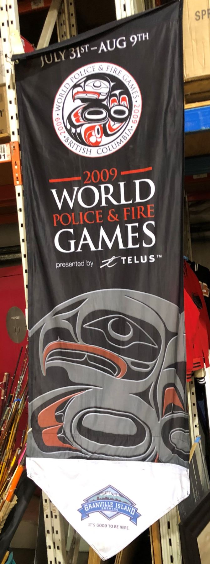 2009 world police & fire games July 31st - Aug. 9th BC hanging street flag w/First Nations motif