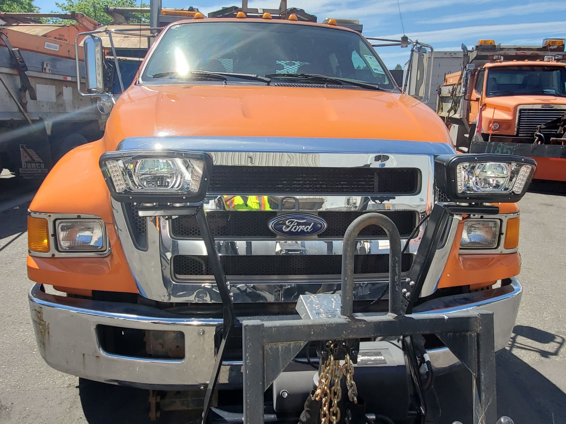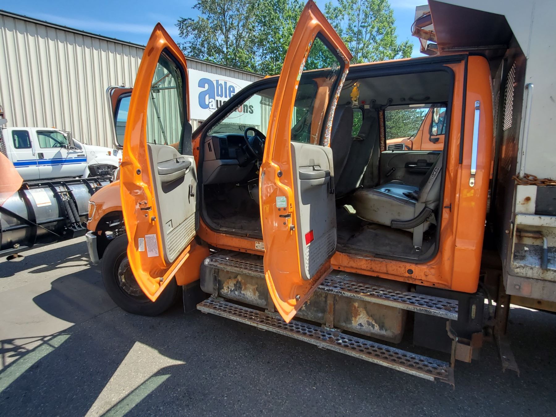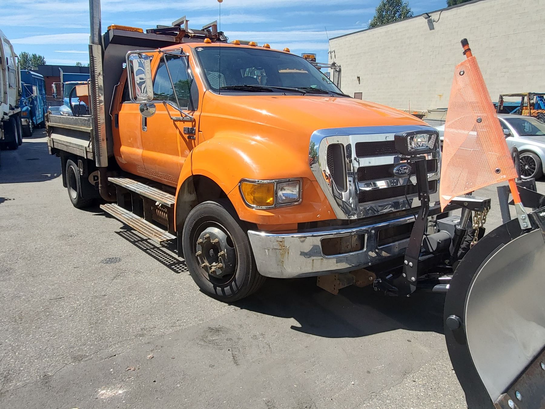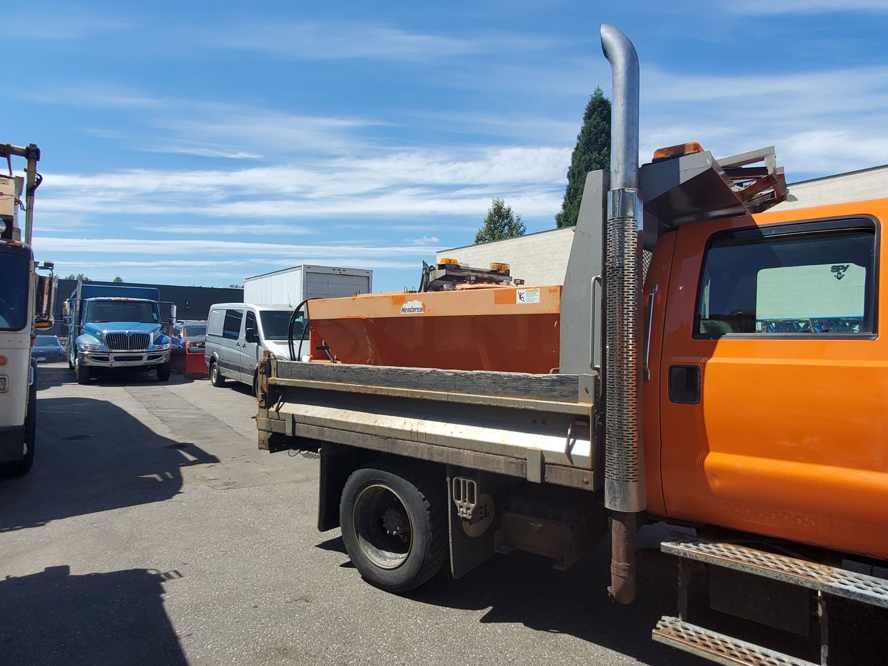 2010 FORD F-650 PRO LOADER XL, 4DR DUMP TRUCK, ORANGE, VIN # 3FRNW6GA3AV249409 117,865KMS, DIESEL, AUTO RD,CD,CC,TW,AC, INSPECTION TILL FEB 2022 LEFT DOOR NOT LOCKING PROPERLY, BUYERS SNOWDOG CM90 PLOW, HENDERSON SALT SPREADER, 1X ICBC NO DETAILS