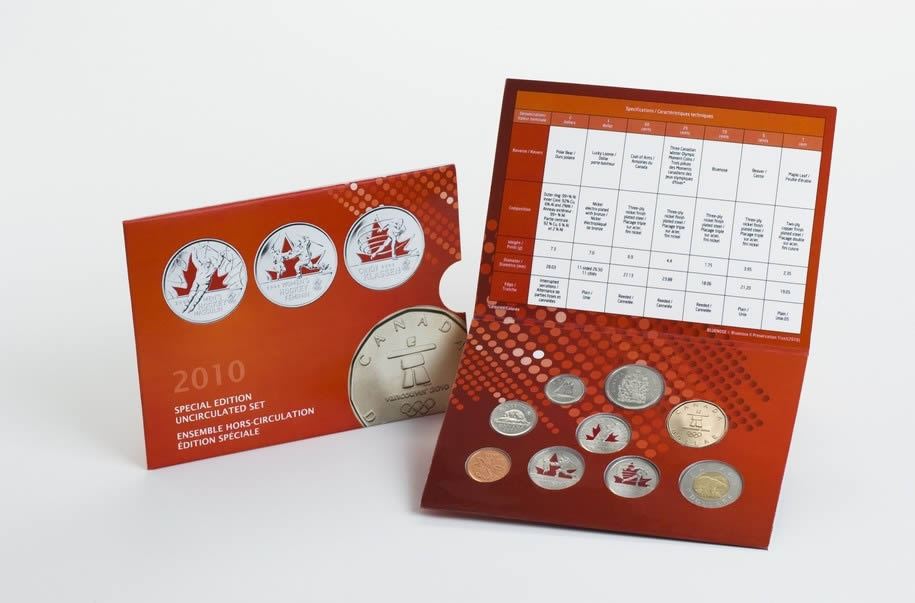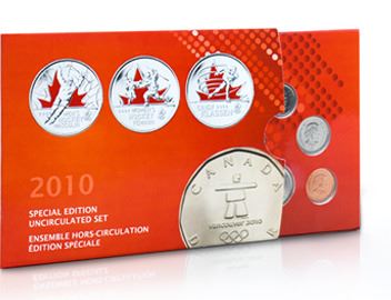 Royal Canadian Mint with Display card, Sleeve, This special edition set features the Vancouver 2010 Lucky Loonie PLUS three 25-cent Canadian Winter Olympic Moments coloured coins.