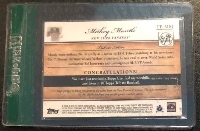 2010 TOPPS TRIBUTE BASEBALL MICKEY MANTLE W/AUTHENTIC GAME WORN MEMORABILIA 62/75