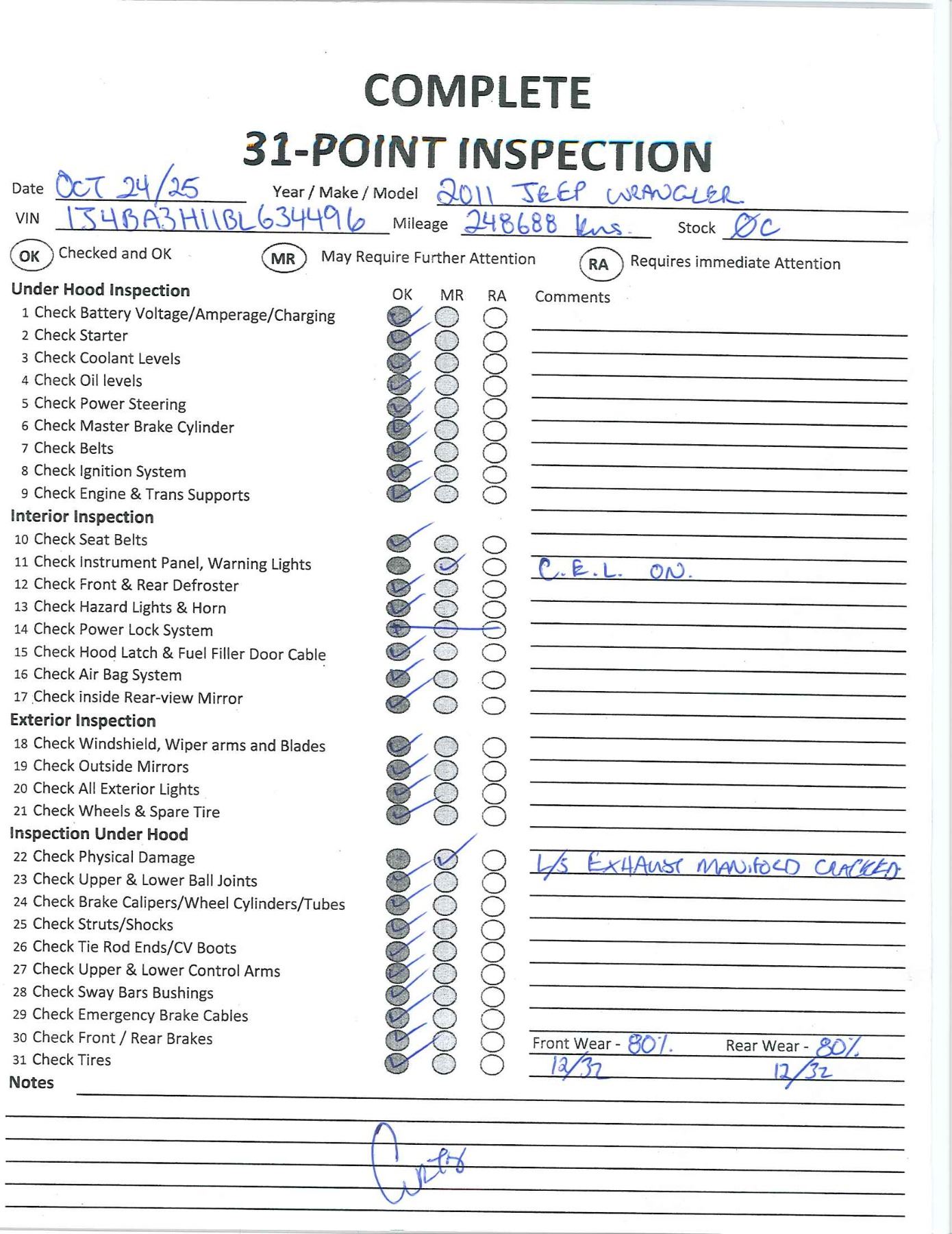 j) Any engines smoking or blow by, noisy lifters, head gaskets and camshaft exceeding 96,000 kms.