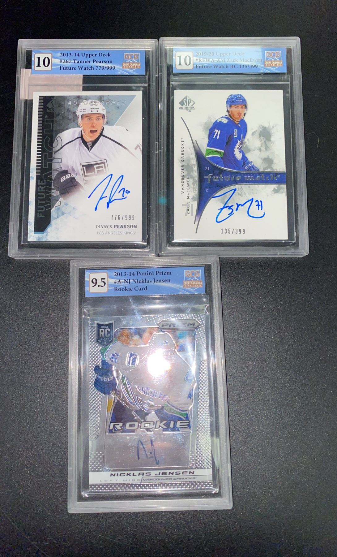 2013-14 PANINI PRIZM #A-NJ NICKLAS JENSEN ROOKIE CARD GCG GRADED 9.5, 2019-20 UPPER DECK #RFWA-ZM ZACH MACEWEN FUTURE WATCH 135/399 CARD GCG GRADED 10 & 2013-14 UPPER DECK #267 TANNER PEARSON FUTURE WATCH 799/999 CARD GCG GRADED 10