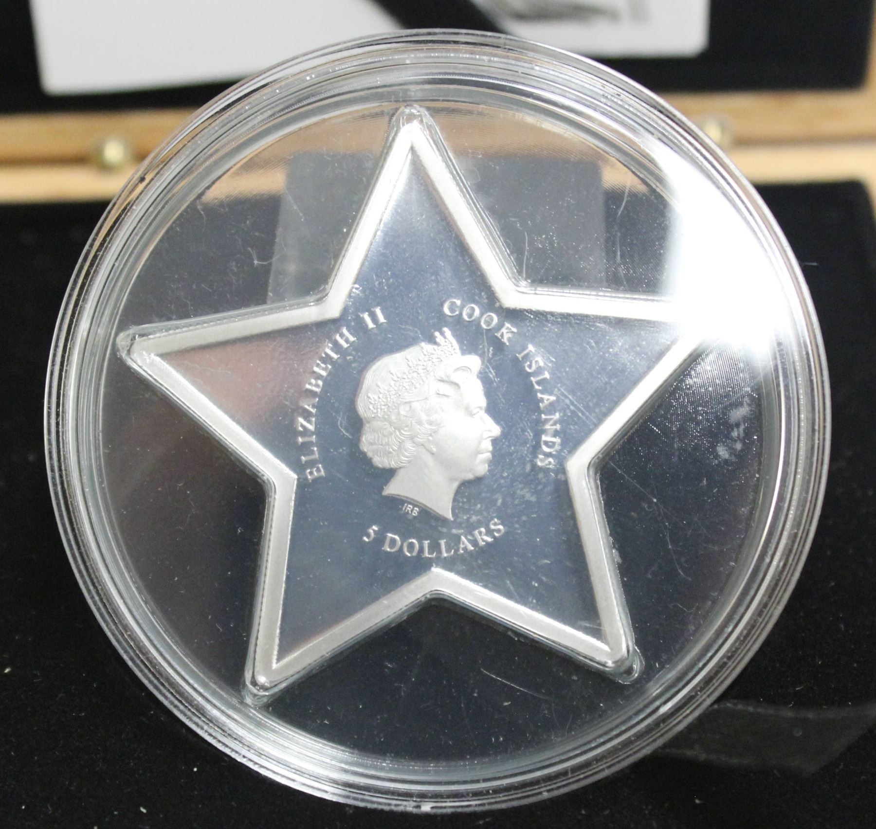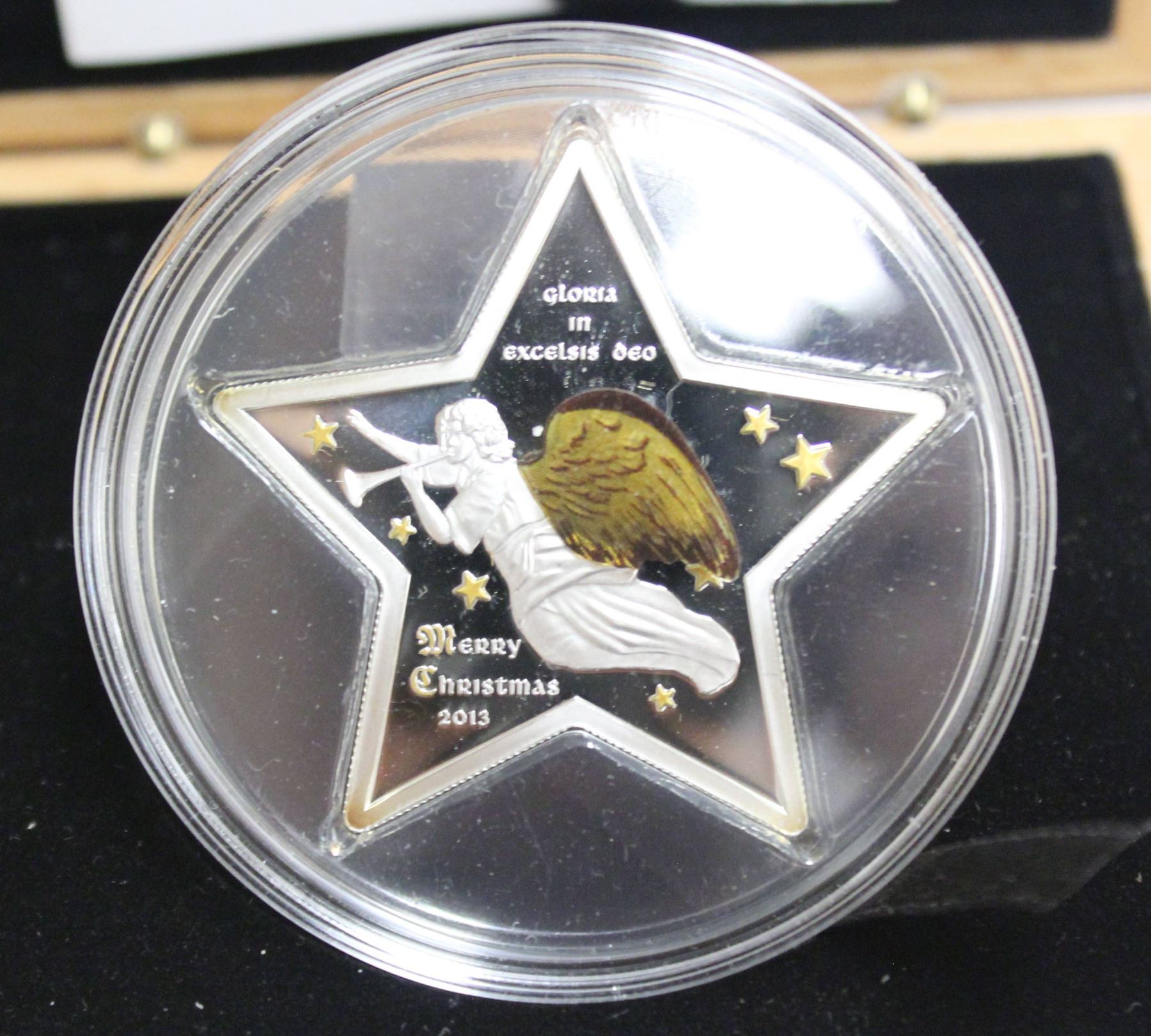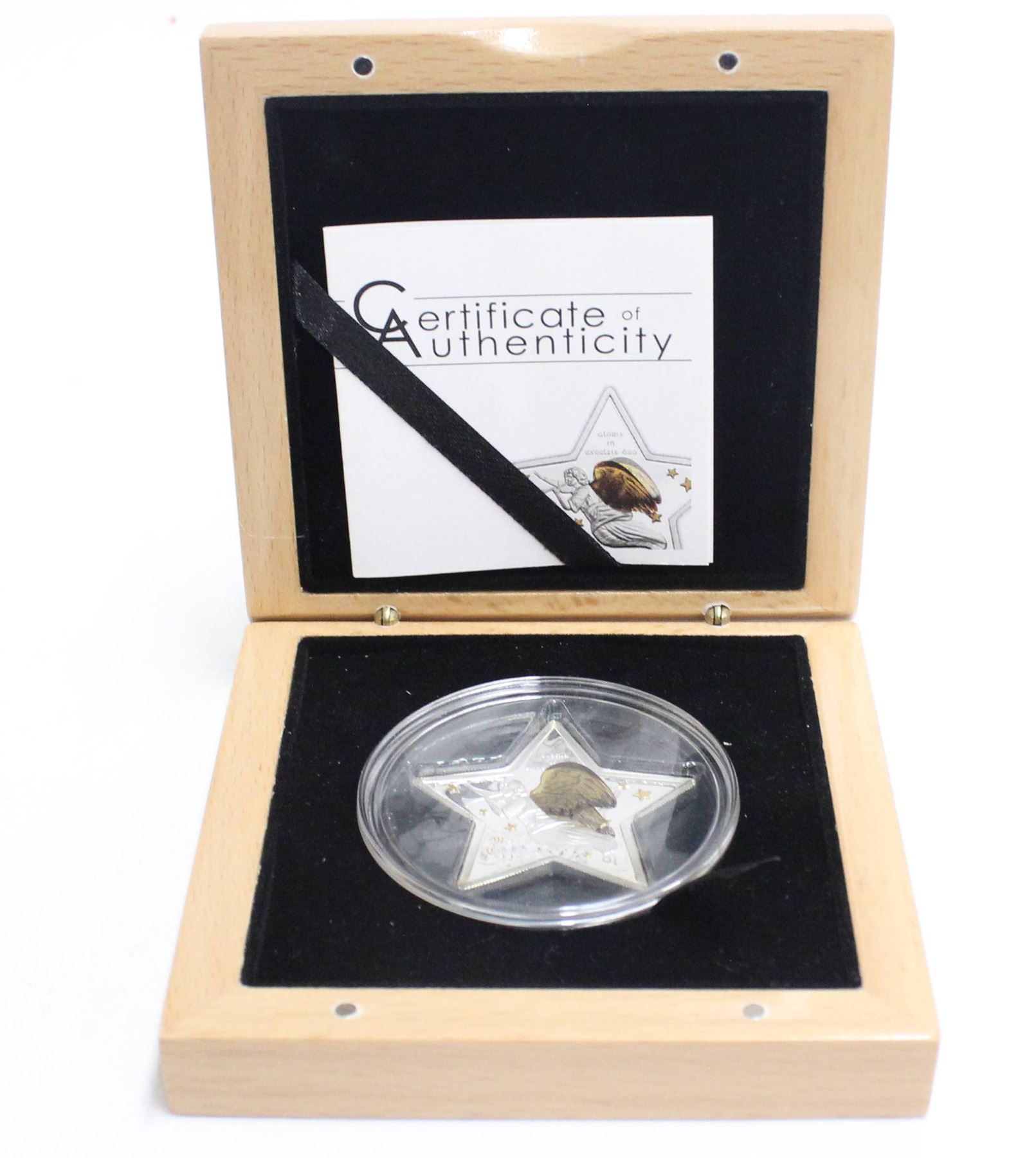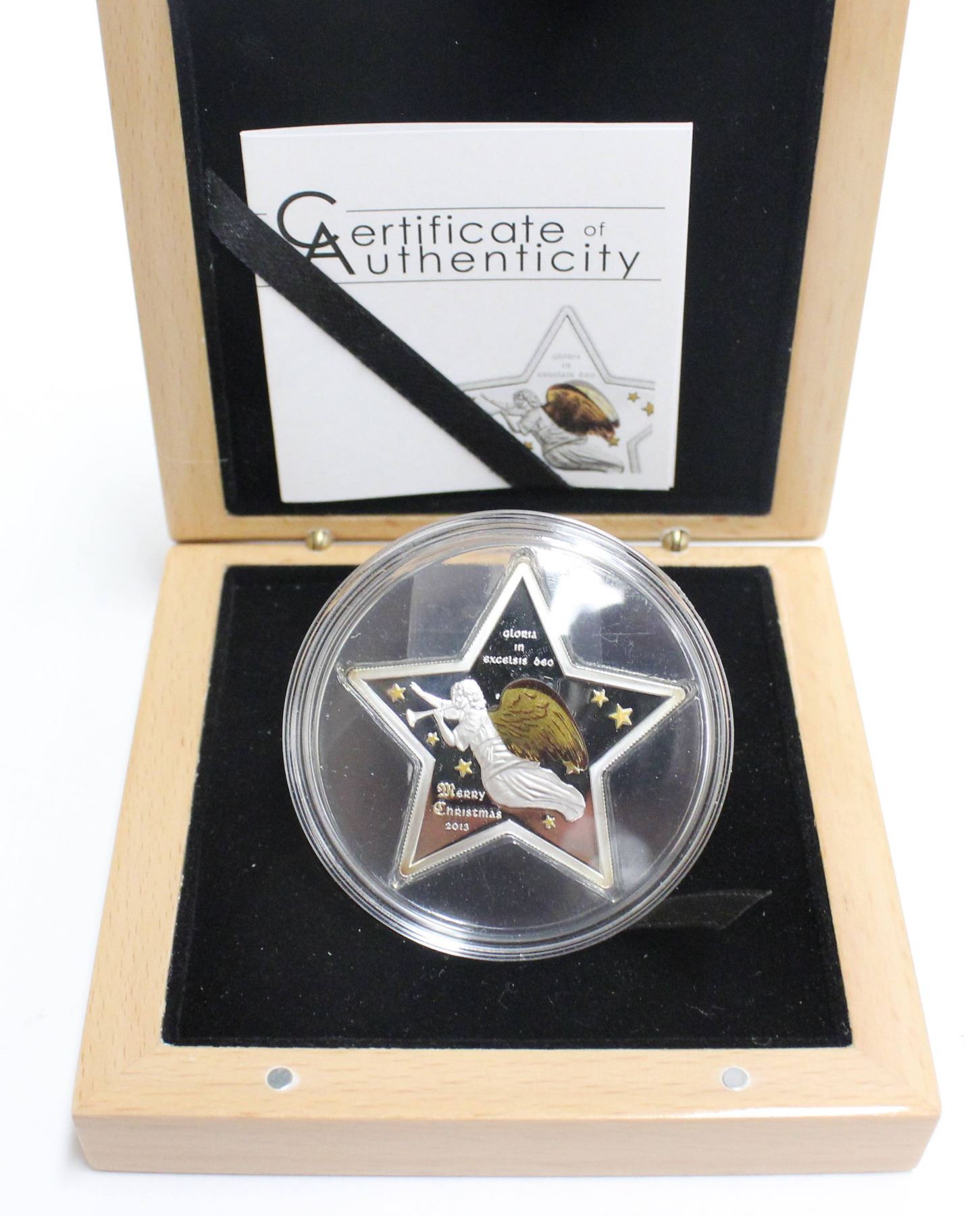 2013 $5 Cook Islands .9999 Pure Silver 3D Merry Christmas Proof Star Coin with 3D Angel Wing Effect with Certificate of Authenticity with Wooden Display Box & outer box