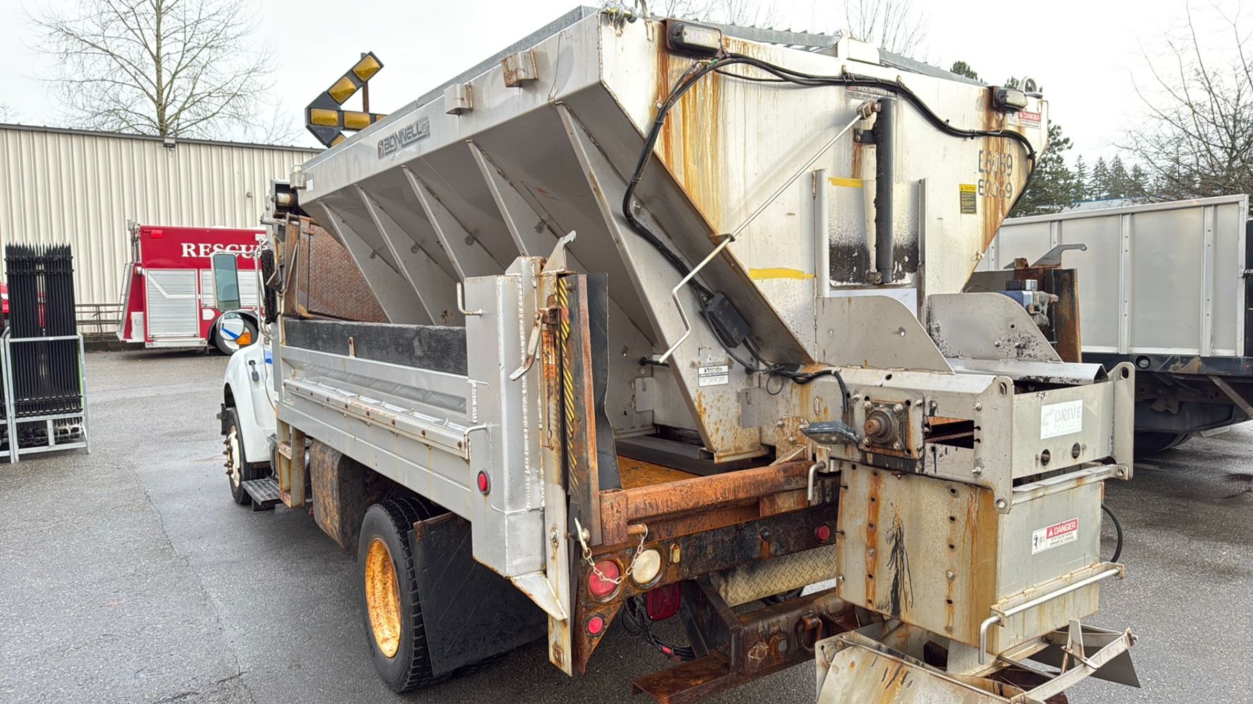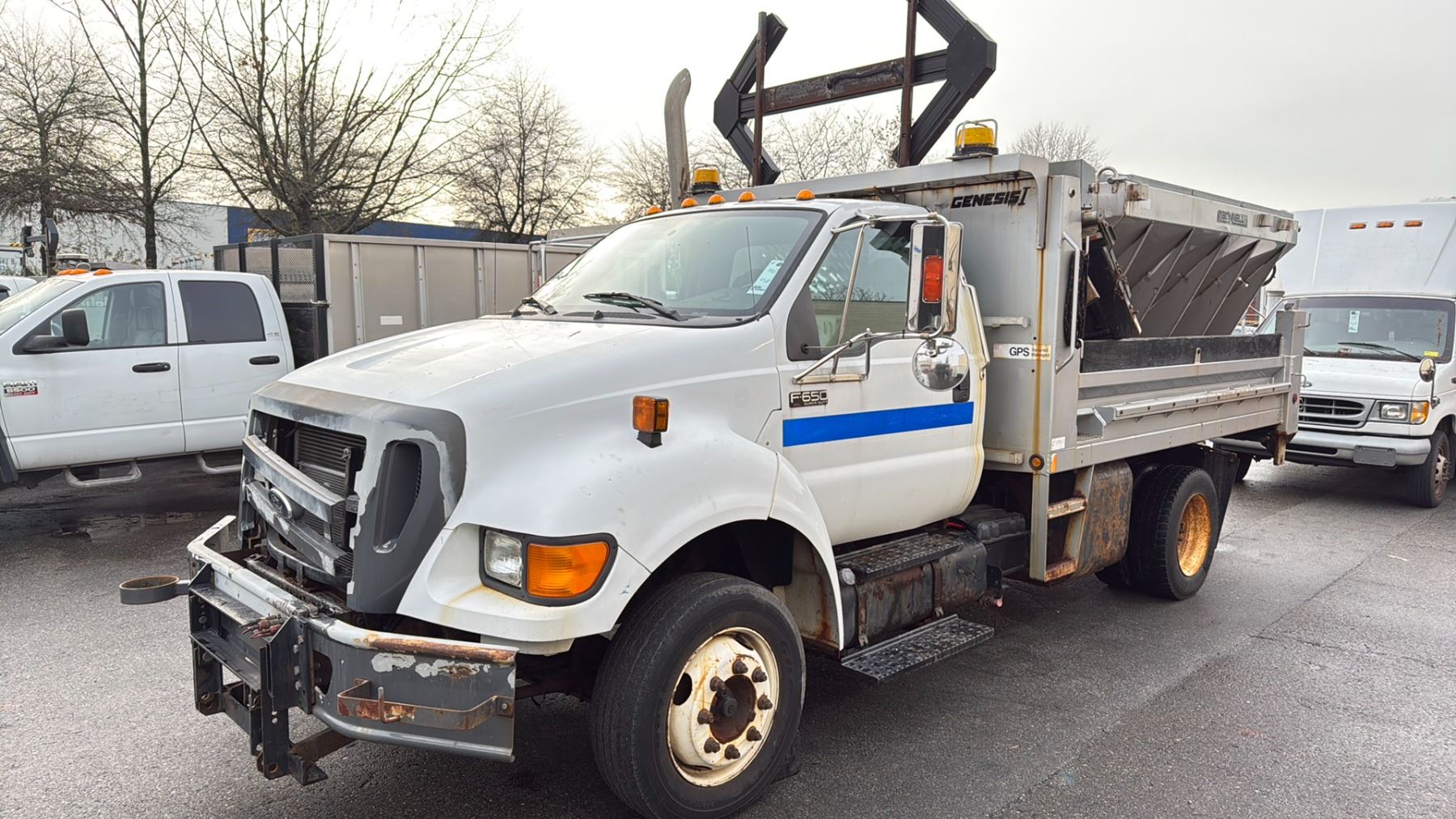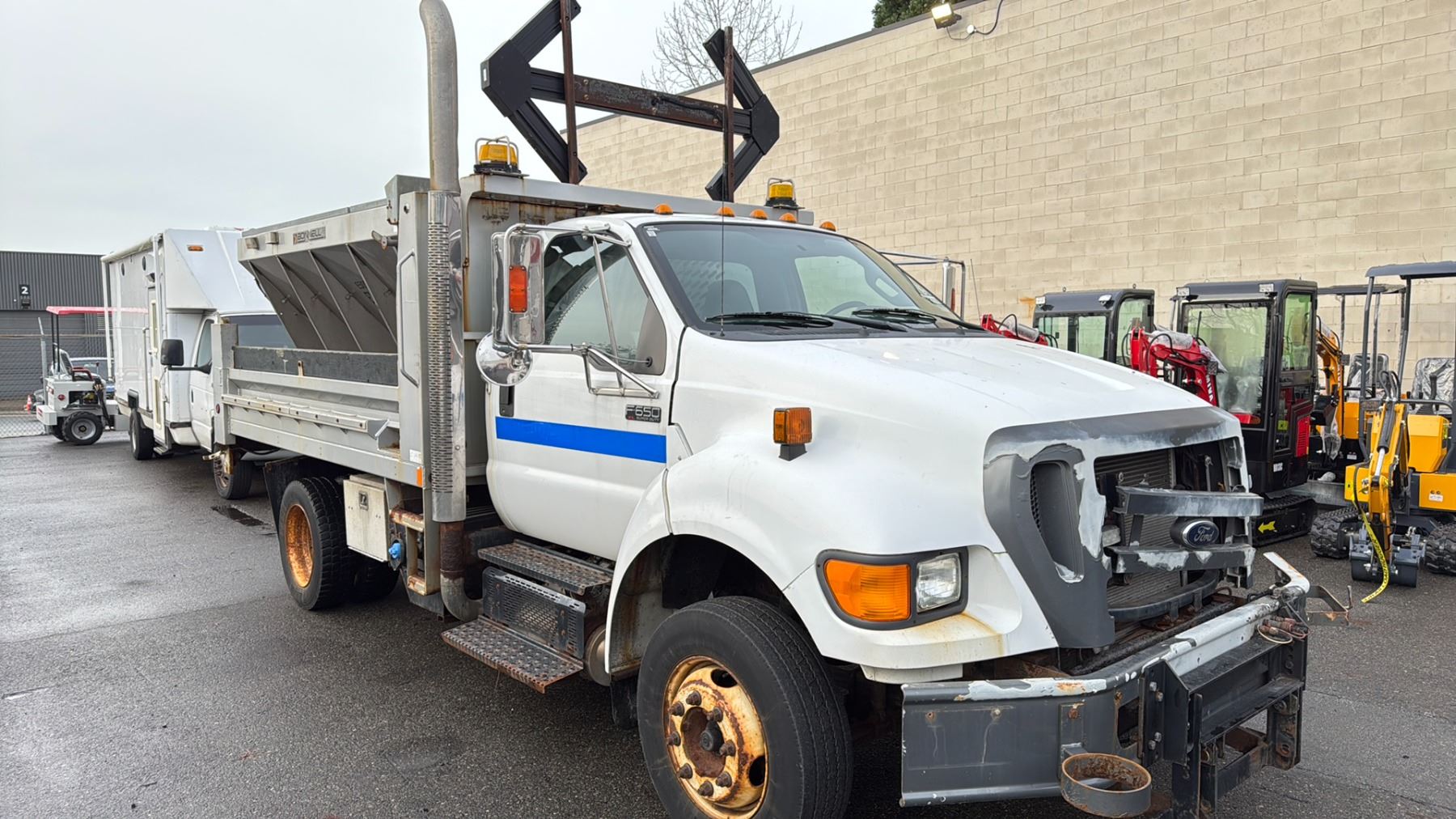 2013 FORD F650 XL SUPERDUTY DUMP TRUCK WHITE VIN 3FRNF6FC7DV019539 64,617 KMS, DIESEL (D), AUTOMATIC, HAS REGISTRATION, HAS KEYS FEATURES: RADIO, CRUISE CONTROL, AIR COND HISTORY: X-CITY WESTERN CONTRACTOR GRADE PLOW ATTACHMENT WITH LIGHTS, 10' X 2.5' PLOW BLADE, ABS LIGHT ON, TC LIGHT ON, PARKING BRAKE DOES NOT WORK, BONNELL SALT SPREADER, SOME RUST, BROKEN GRILL 1 ICBC DECLARATION NO DETAILS