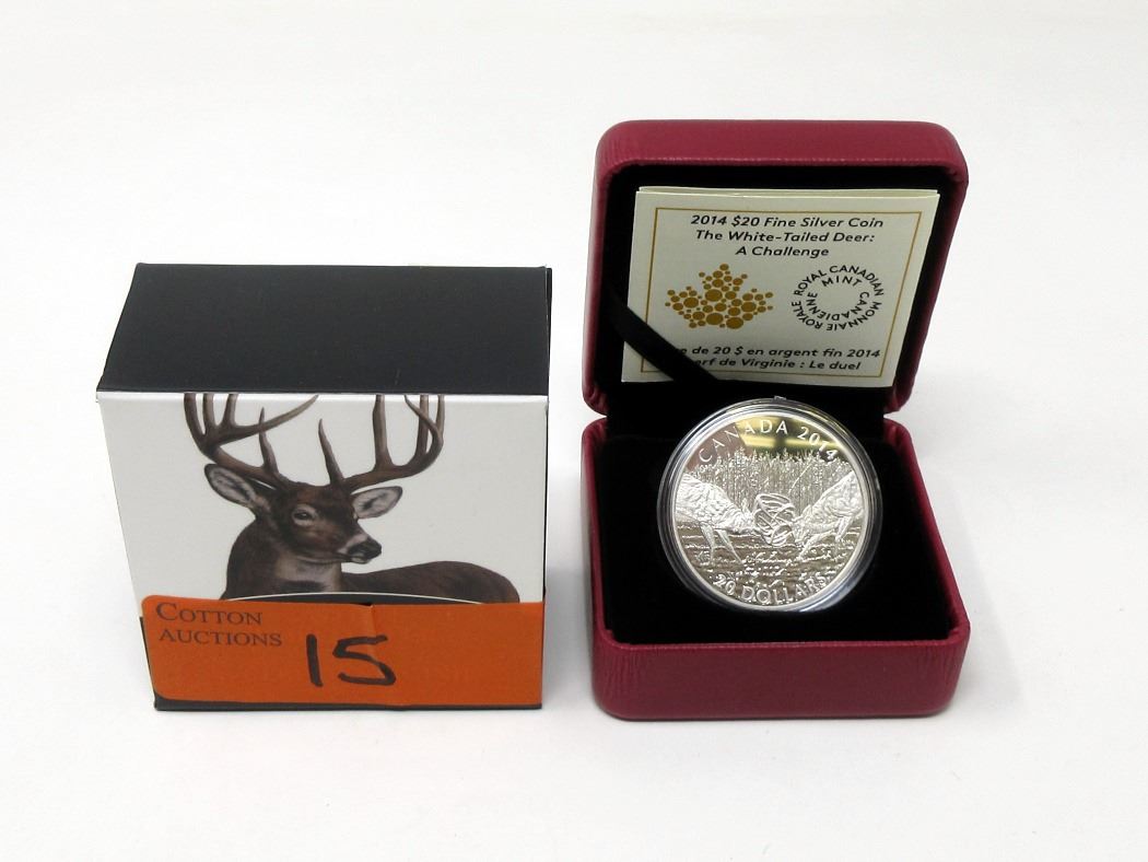 "White Tailed Deer: A Challenge". 31.39 Grams. Mintage of 7.500. In original box with mint certificate. Tax exempt.