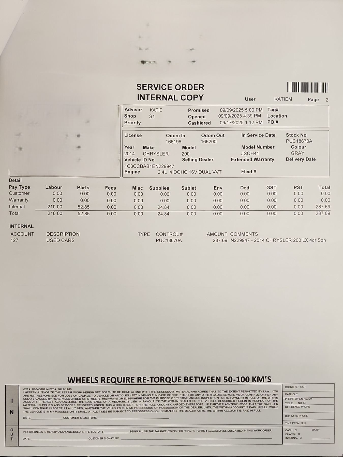 2014 CHRYSLER 200, GREY, 166207 KMS, 2.4L, 4 CYLINDER, GASOLINE, AUTOMATIC, TRANSMISSION, FRONT WHEEL DRIVE, 5 PASSENGER. AIR CONDITIONING, POWER WINDOWS, POWER LOCKS, KEY-LESS ENTRY, TILT STEERING, CRUISE CONTROL, ALLOY WHEELS, ANTI THEFT, DUAL AIR BAGS, CD PLAYER, BLUETOOTH, TRACTION CONTROL, POWER MIRRORS, SPLIT-FOLDING REAR SEATS. DECLARATIONS: NO DESIGNATIONS 2 ACCIDENTS 0 GLASS CLAIM, TOTALLING $1274. SERVICE HISTORY SHOWS1 RECORDS. AUCTION NOTES: STOCK #: D229947 1C3CCBAB1EN229947 NOT SUITABLE FOR TRANSPORTATION, MUST TOW.