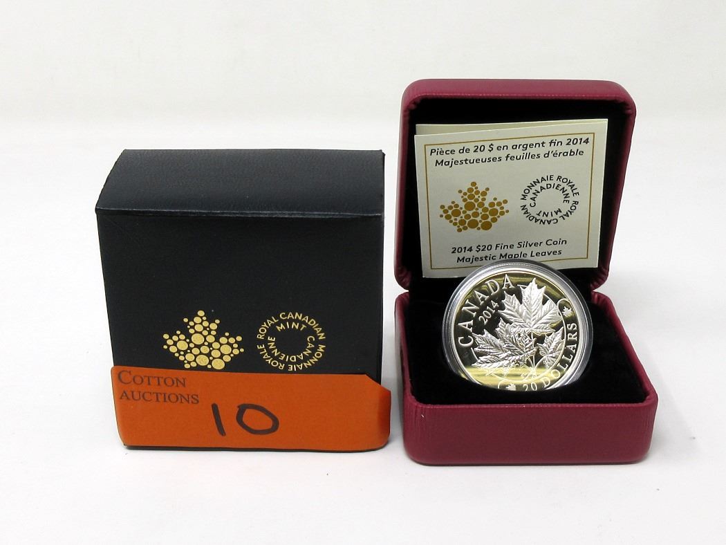.9999 Silver. "Majestic Maple Leaves" 31.39 Grams. Complete with certificate in Canadian Mint box. Only 8,500 minted. Tax exempt.