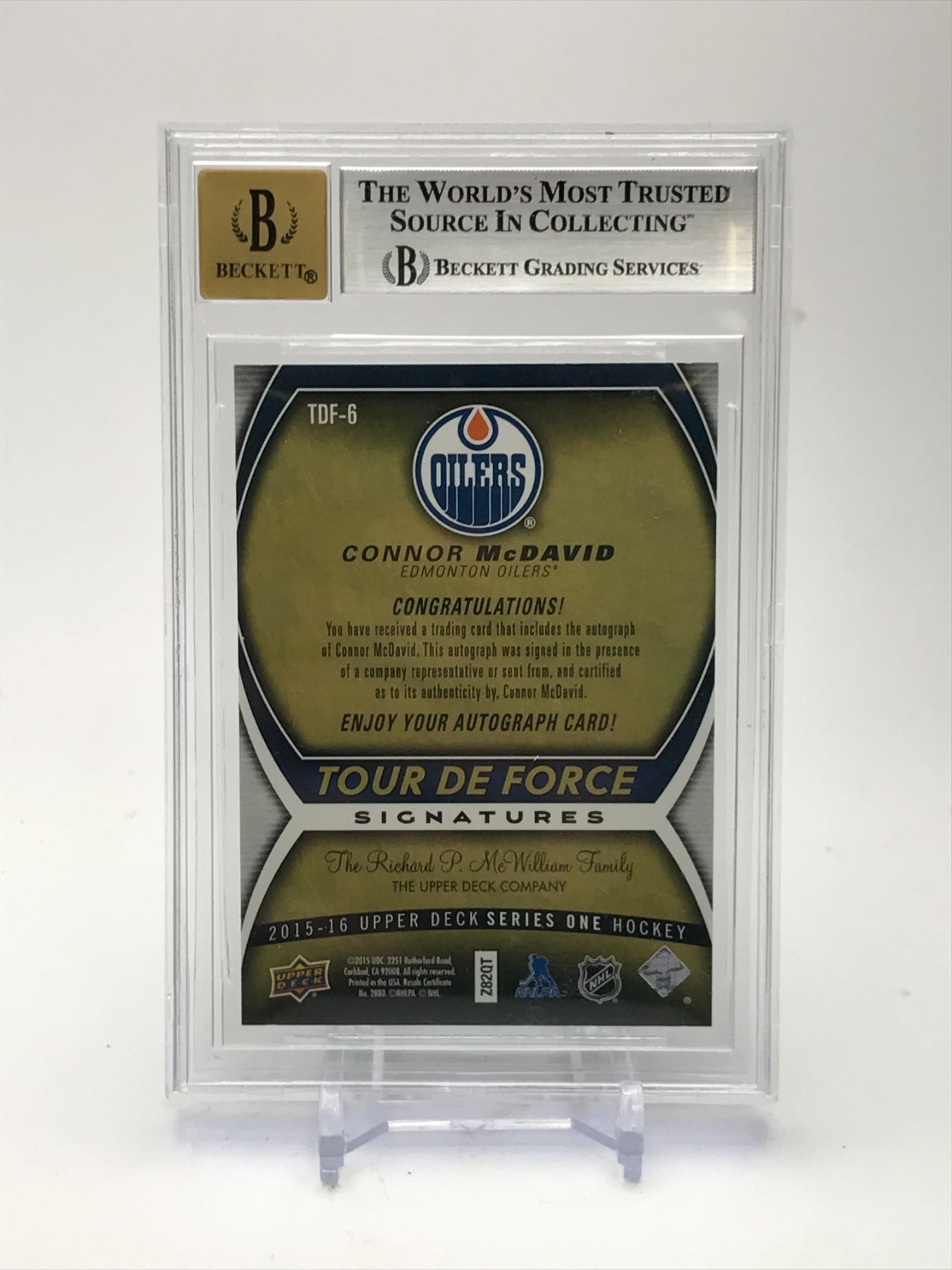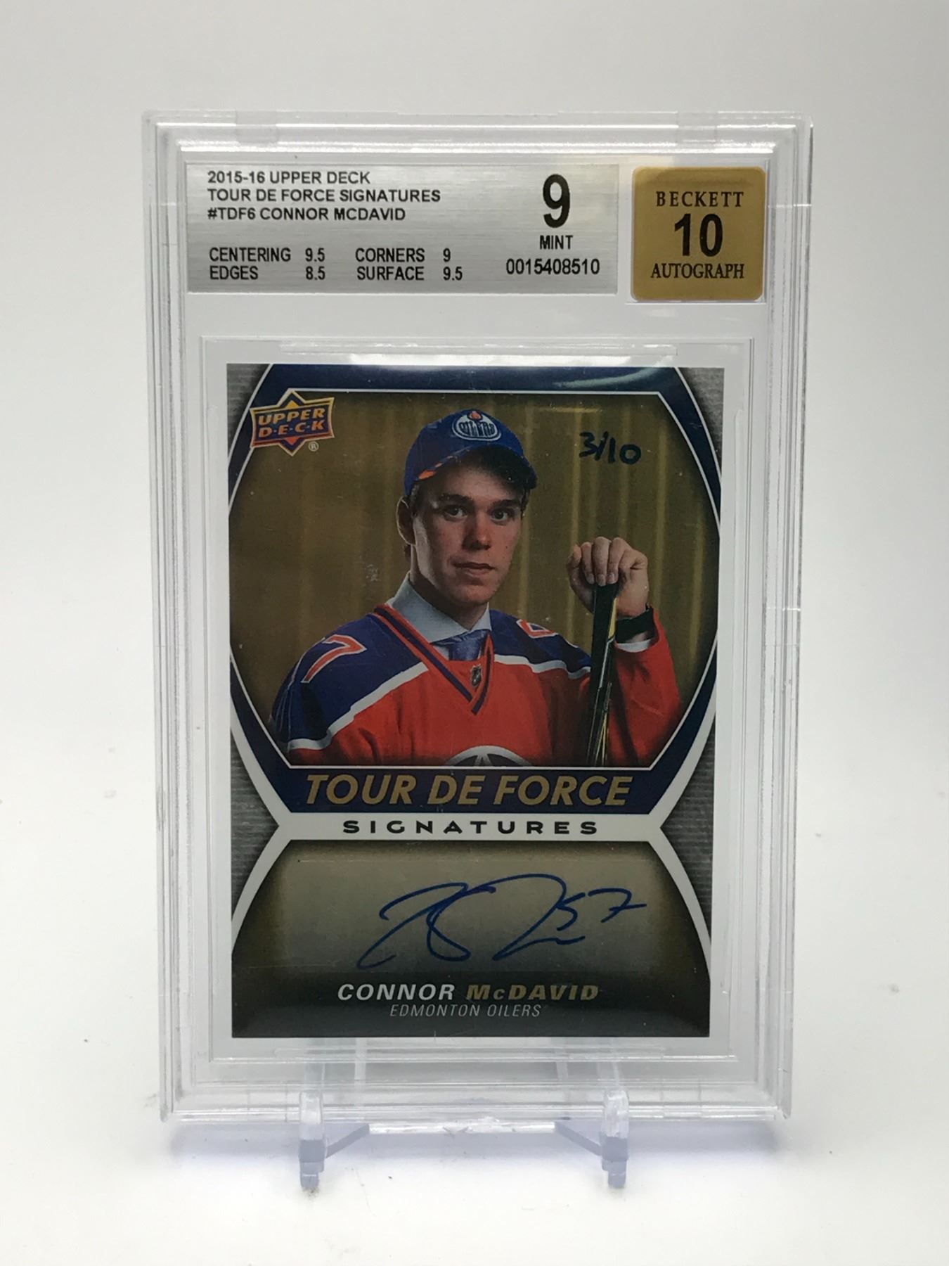 2015-16 UD TOUR DE FORCE SIGNATURES CONNOR MCDAVID ROOKIE 3/10 (BECKETT 9/10)