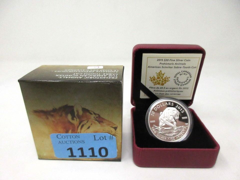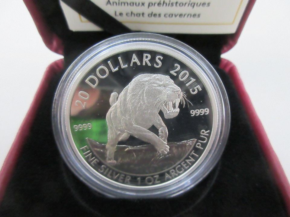 "American Scimitar Sabre-Tooth Cat". 31.39 grams. Ltd. Mintage: 7,500. In original Canadian Mint box with certificate. Tax exempt.