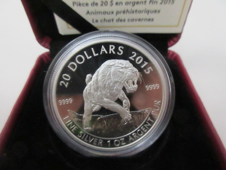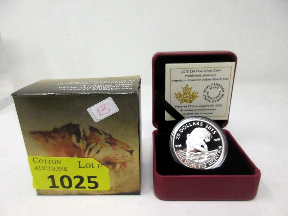 "American Scimitar Sabre-Tooth Cat". 31.39 grams. Ltd. Mintage: 7,500. In original Canadian Mint box with certificate. Tax exempt.