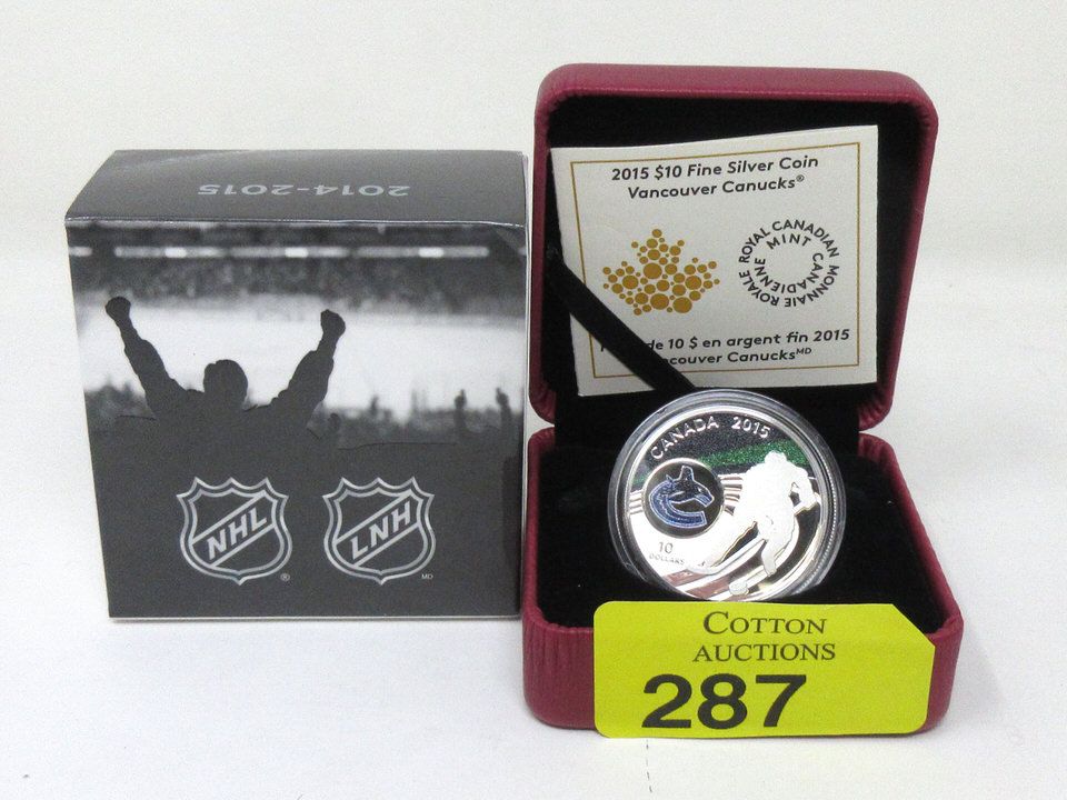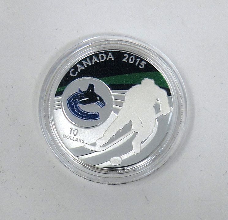 "Vancouver Canucks". 15.87 Grams. Coloured coin. $10 Face value. Mintage: 6,000. In original box with mint certificate. Tax exempt.