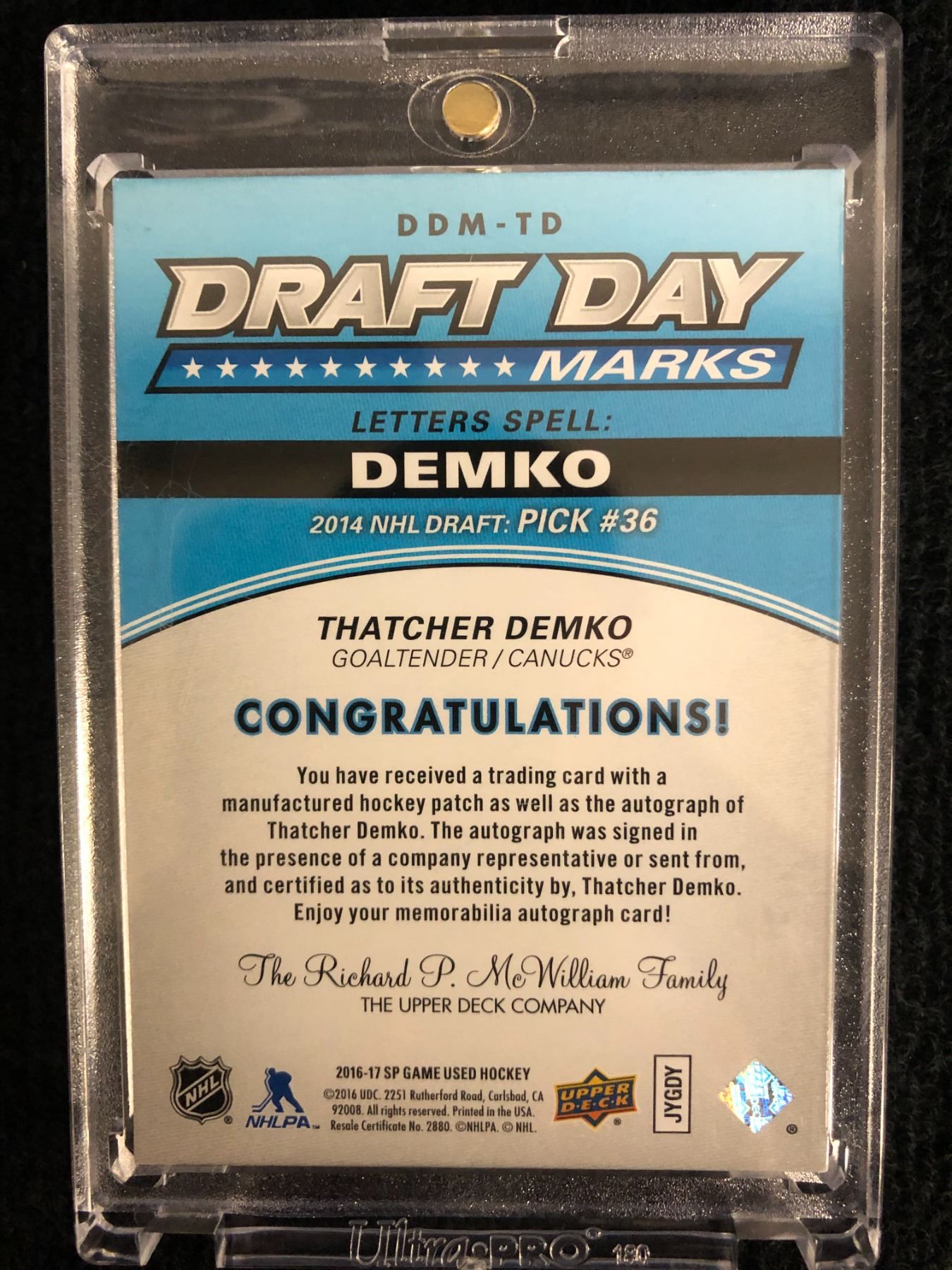 2016-17 SP Game Used Draft Day Marks "D" Auto Patch THATCHER DEMKO Rookie 03/35