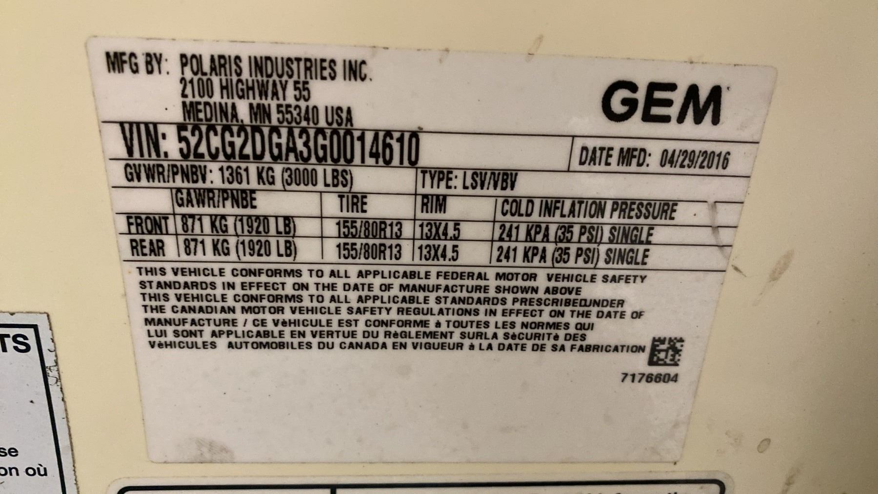 2016 POLARIS GEM ELXD UTILITY VEHICLE WHITE VIN 52CG2DGA3G0014610 25,558 KMS, ELECTRIC (E), 6.5KW (8.7HP), AUTOMATIC, HAS REGISTRATION, HAS KEYS FEATURES: TRAILER HITCH HISTORY: X-CITY MINOR SCRATCHES AND DENTS, BODY PANEL DAMAGE, ROOF MOUNTED SAFETY LIGHT, SPARE TIRE NO ICBC DECLARATIONS
