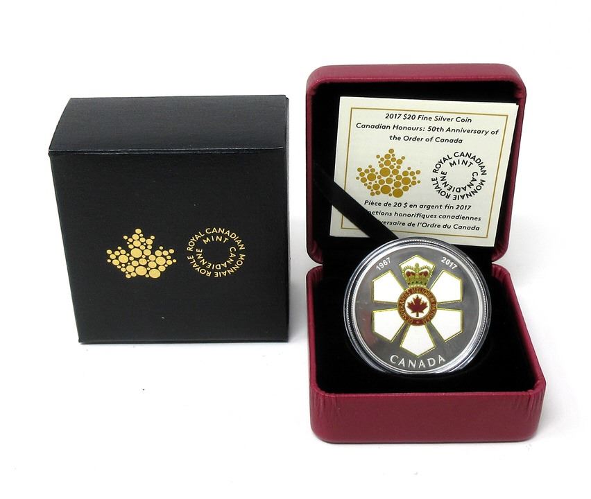 "Canadian Honours: 50th Anniversary of the Order of Canada". Colourized. In RCM box with RCM certificate. Mintage 5,500. Tax exempt