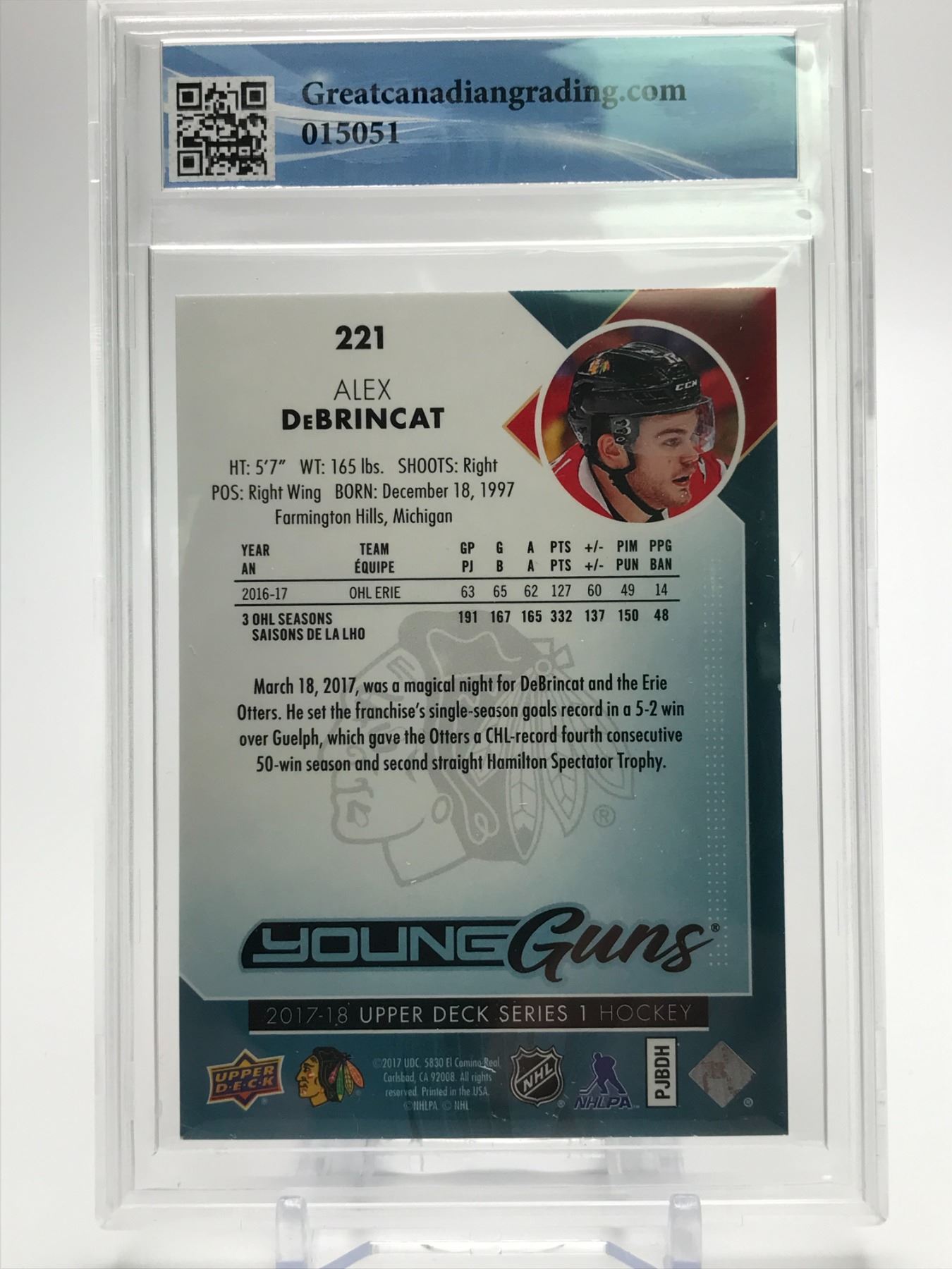 2018-18 UPPER DECK ALEX DEBRINCAT YOUNG GUNS ROOKIE CARD (GCG 10)