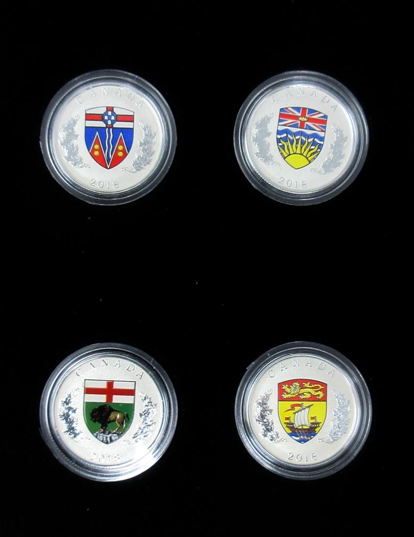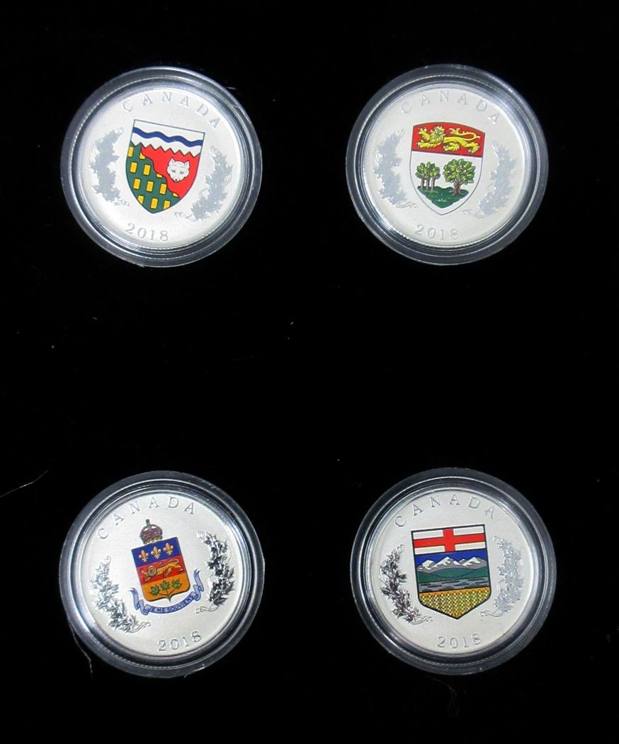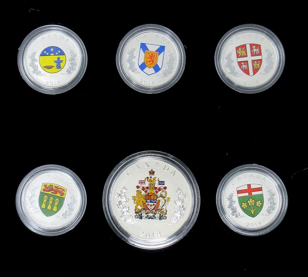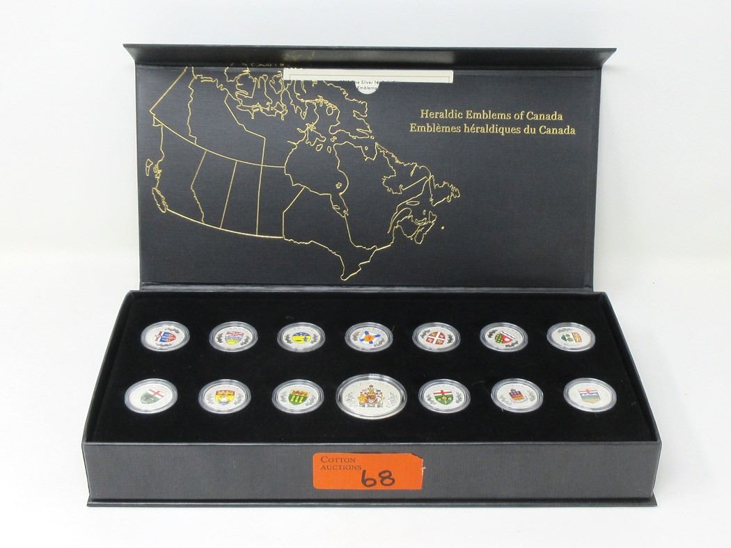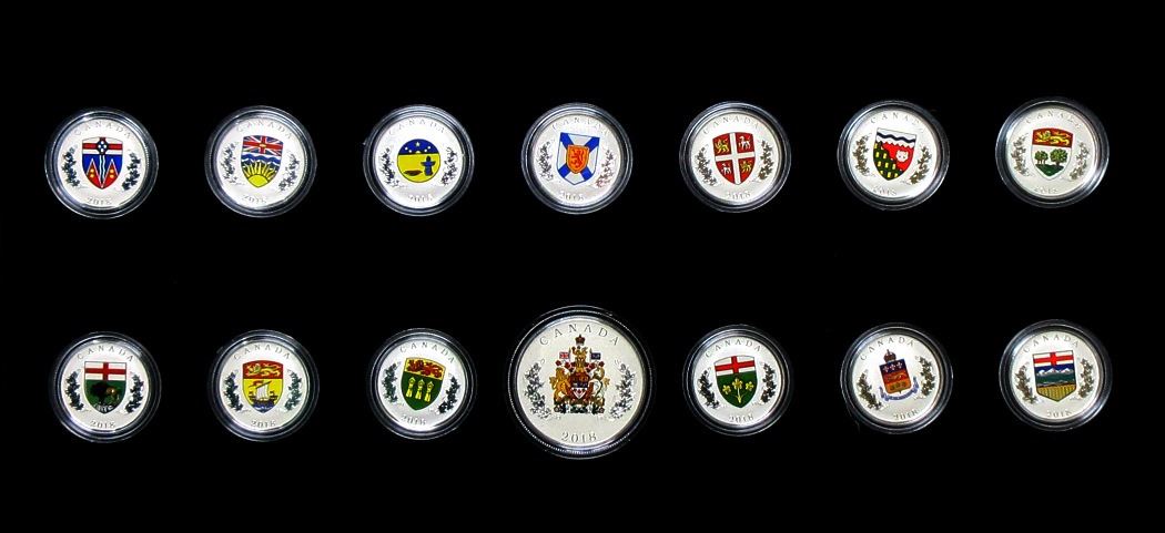 14 Coloured .9999 Silver Coins. The Arms of Canada Coin weighs 15.87 grams and the 13 coins weigh 6 grams each. Original mint box and certificate. Ltd. Mintage of 4,000. Tax exempt.