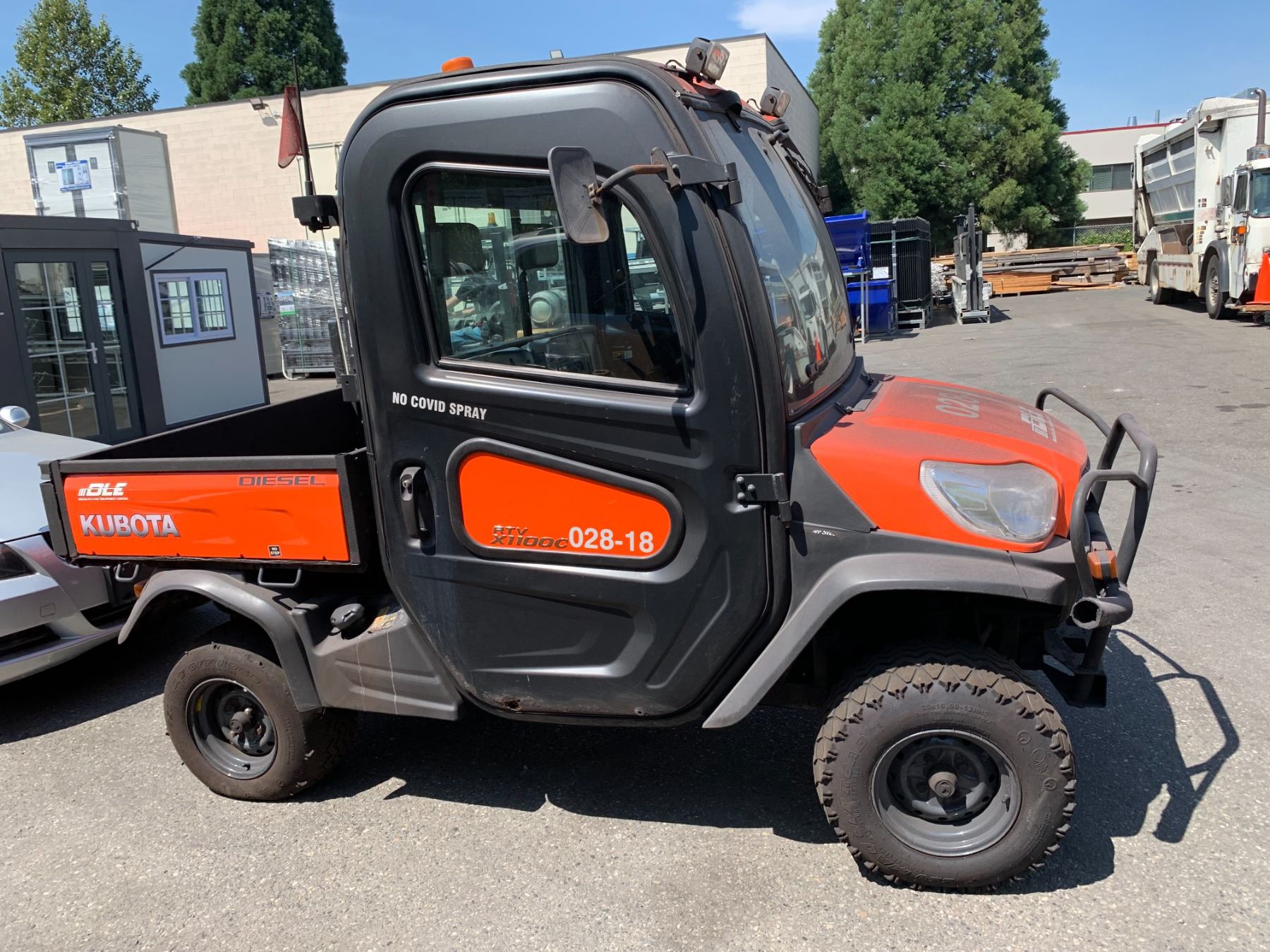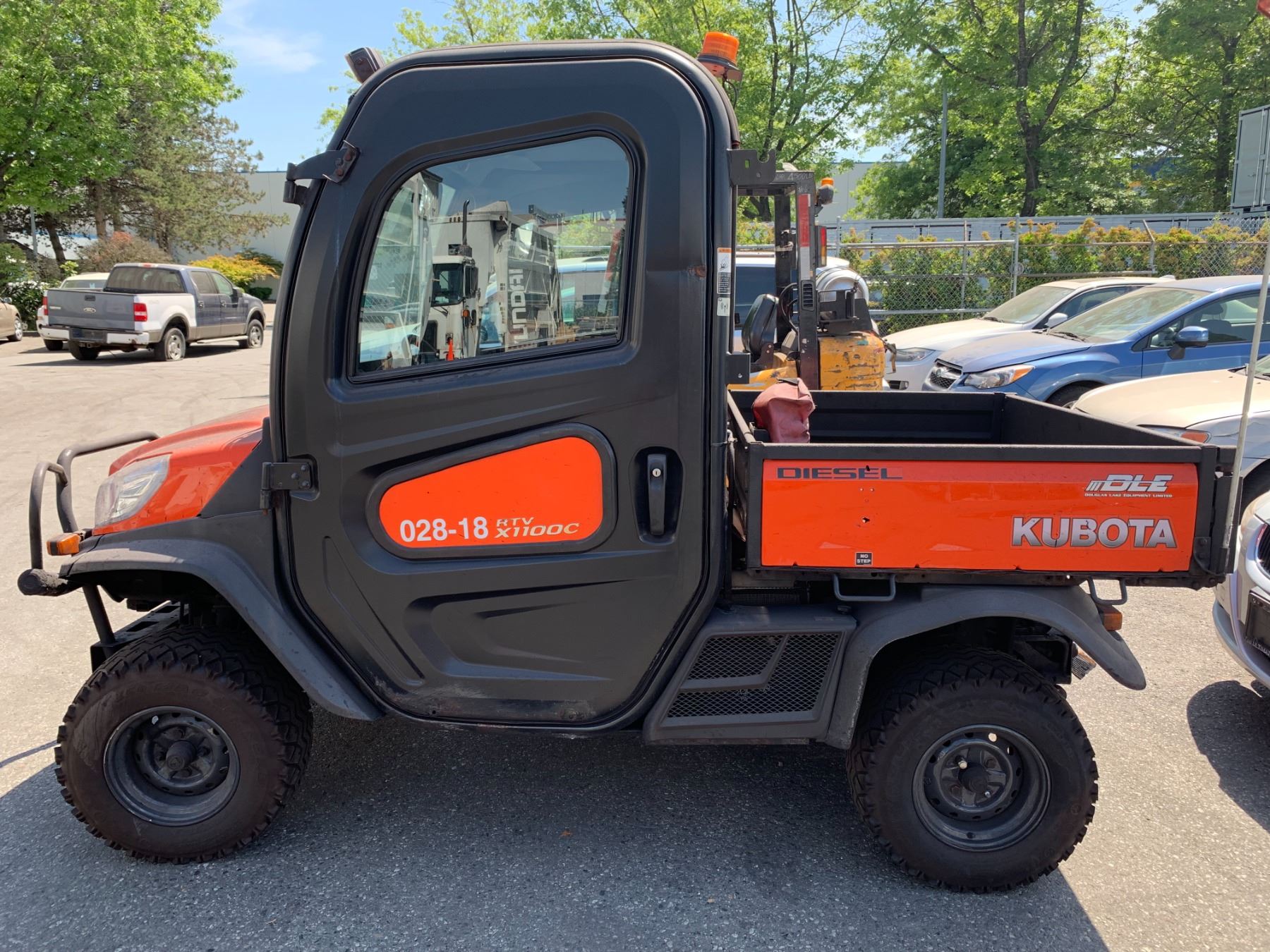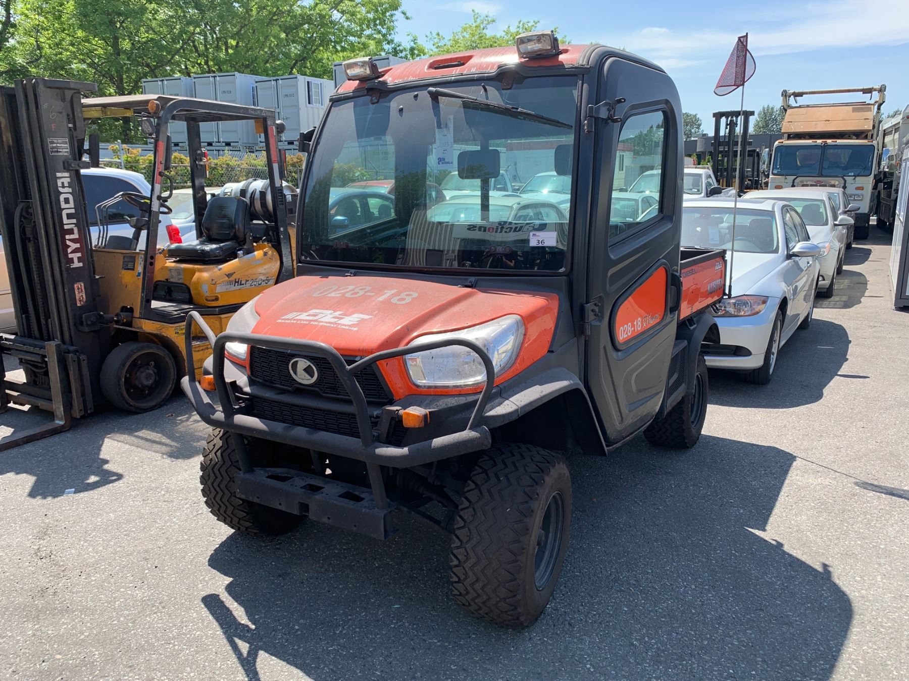2018 KUBOTA X1100C 2DR RTV, ORANGE, VIN A5KC2GDBPJG041713, 2,103.3 HRS (HOURS NOT VERIFIED), KEYS, STARTS, WAS USED AT A POT ASH FACILITY, WORKING POWER DUMP BOX, DIESEL, ENCLOSED CAB, HAS 4X4, GOES FORWARD & REVERSE, HAS RUST ISSUES, FIRE EXTINGUISHER, PNEUMATIC TIRES, *HAS REGISTRATION* NO ICBC DECLARATIONS