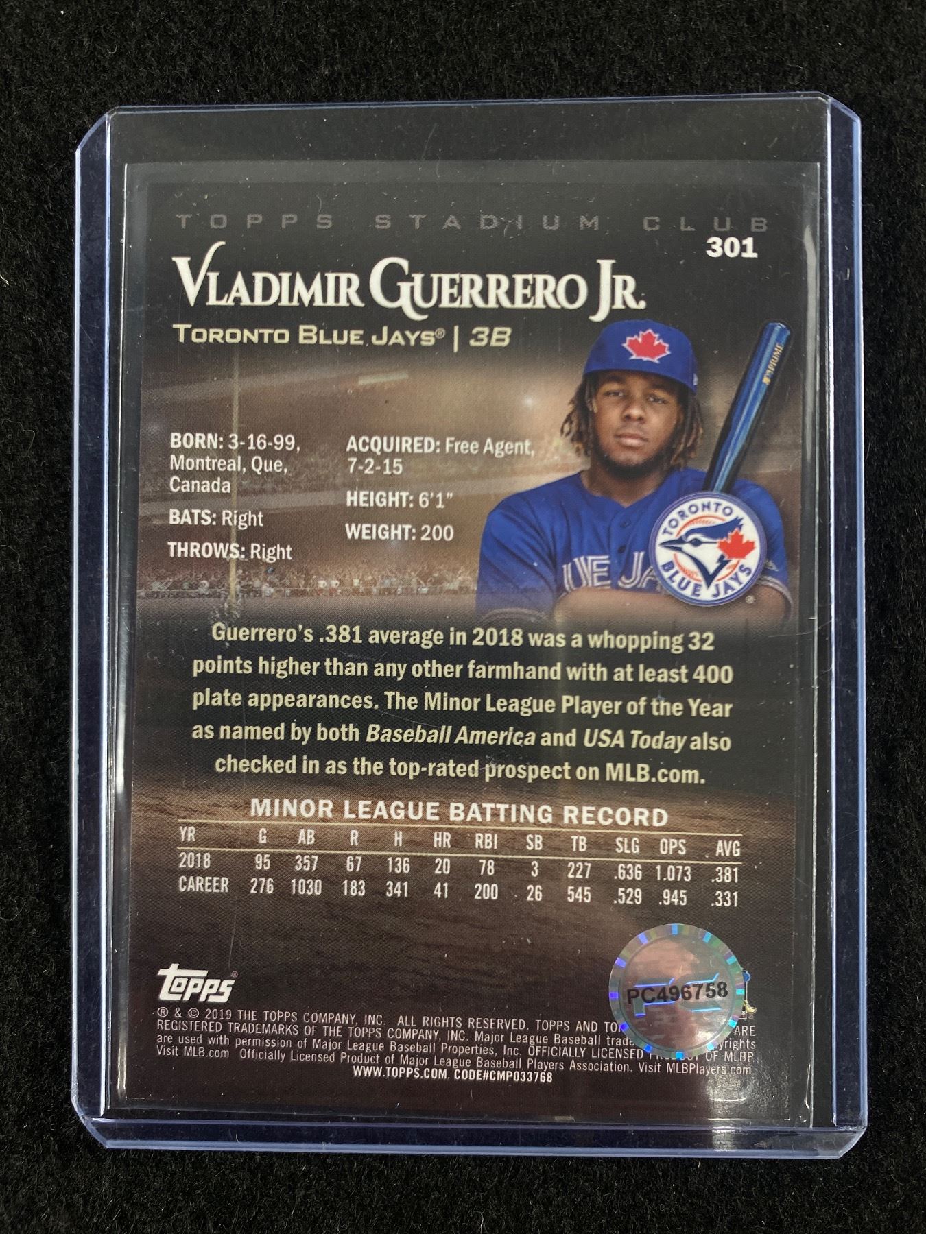 2019 Topps Autographed Vladimir Guerrero Jr. MLB Card w/ C.O.A