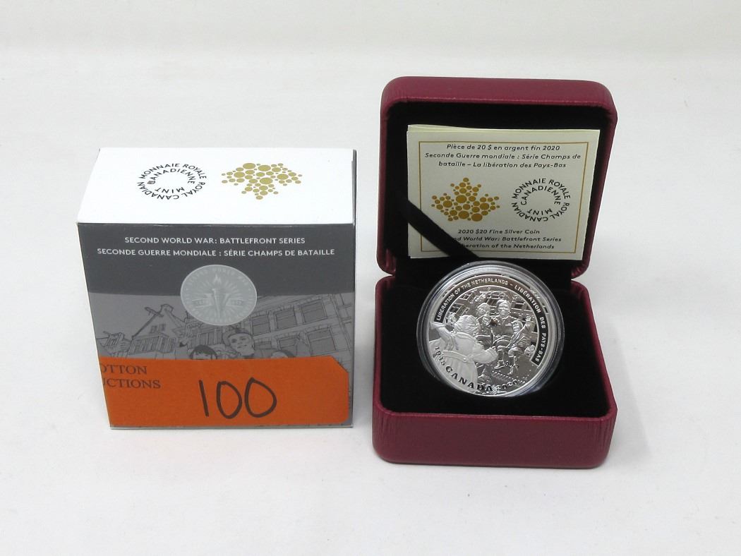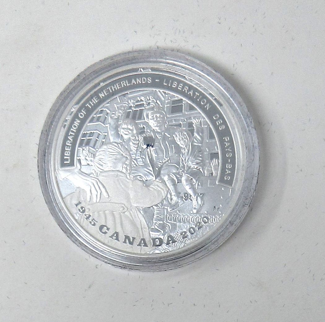 "The Liberation of the Netherlands". 31.39 Grams. Complete with certificate in Canadian Mint box. Only 7,500 minted. Tax exempt.